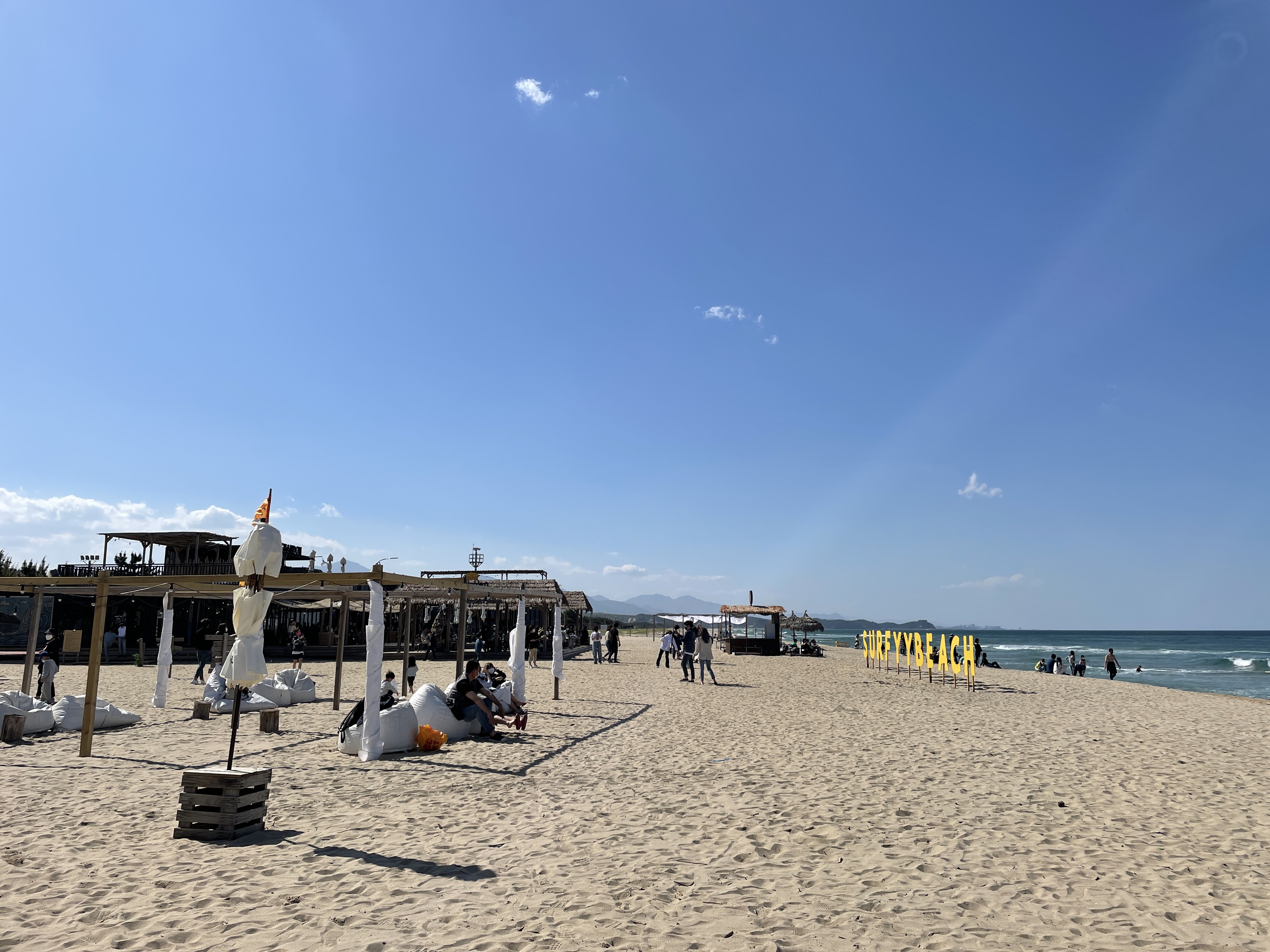양양 서피비치 정말 핫한 곳이다. 다들 들어보셨을 것이라 생각한다. TV에도 서핑 소개한다고 가끔 나왔던 것 같다. 다들 여기 갔다고 하면 거기 유명한 그 서퍼 있으신 곳 아니냐고 하더라. 물론 보진 못했고 그분이 누구인지도 잘 모르겠다. TV에서 본 적이 없어서. 근데 여기 오면 서핑을 즐기고 계신 분들이 있다. 강습을 받기도 하고 잘 타시는 분들끼리 서로 타면서 놀기도 하고 그러신다. 그리고 애초에 서핑 말고 물놀이를 하러 바다 자체에 들어갈 수가 없다. 이번에 알았는데 가만히 앉아 바람도 즐기고 풍경도 보고 그러고 있었는데 어떤 사람이 발을 담그려고 하니까 호루라기를 불며 나오라고 하셨다. 솔직히 발까지 담그는 것은 상관없어 보였지만 한 명이 놀기 시작하면 걷잡을 수 없기 때문에 미연에 방지하는 것 같다. 서퍼가 없는 곳까지 그렇게 관리하셨으니 말이다. 여기가 사유 재산 지역인가? 그런 것까지는 잘 모르겠는데 그러니까 이렇게 칸막이도 두고 운영하시는 것 아닐까 싶다.