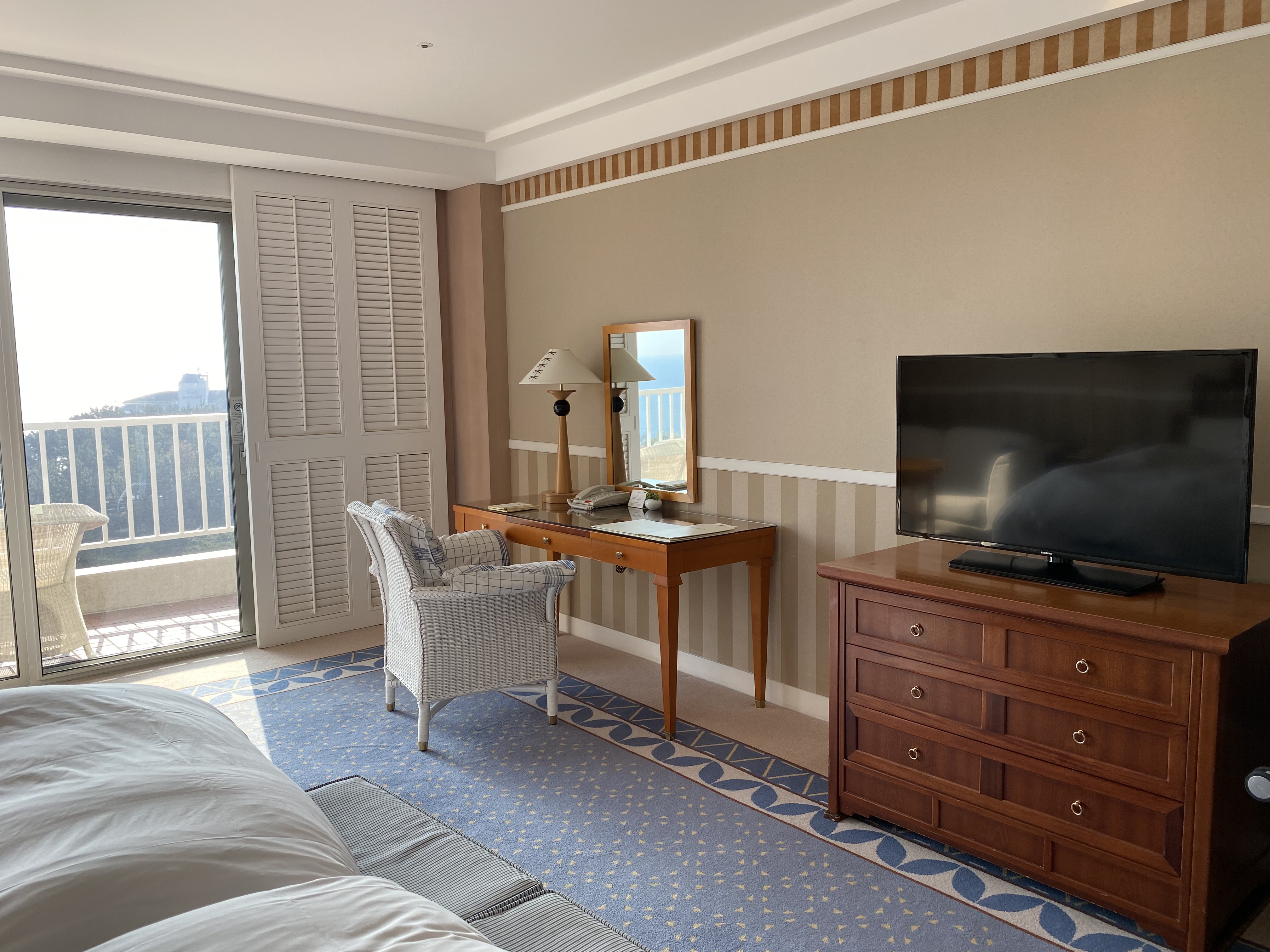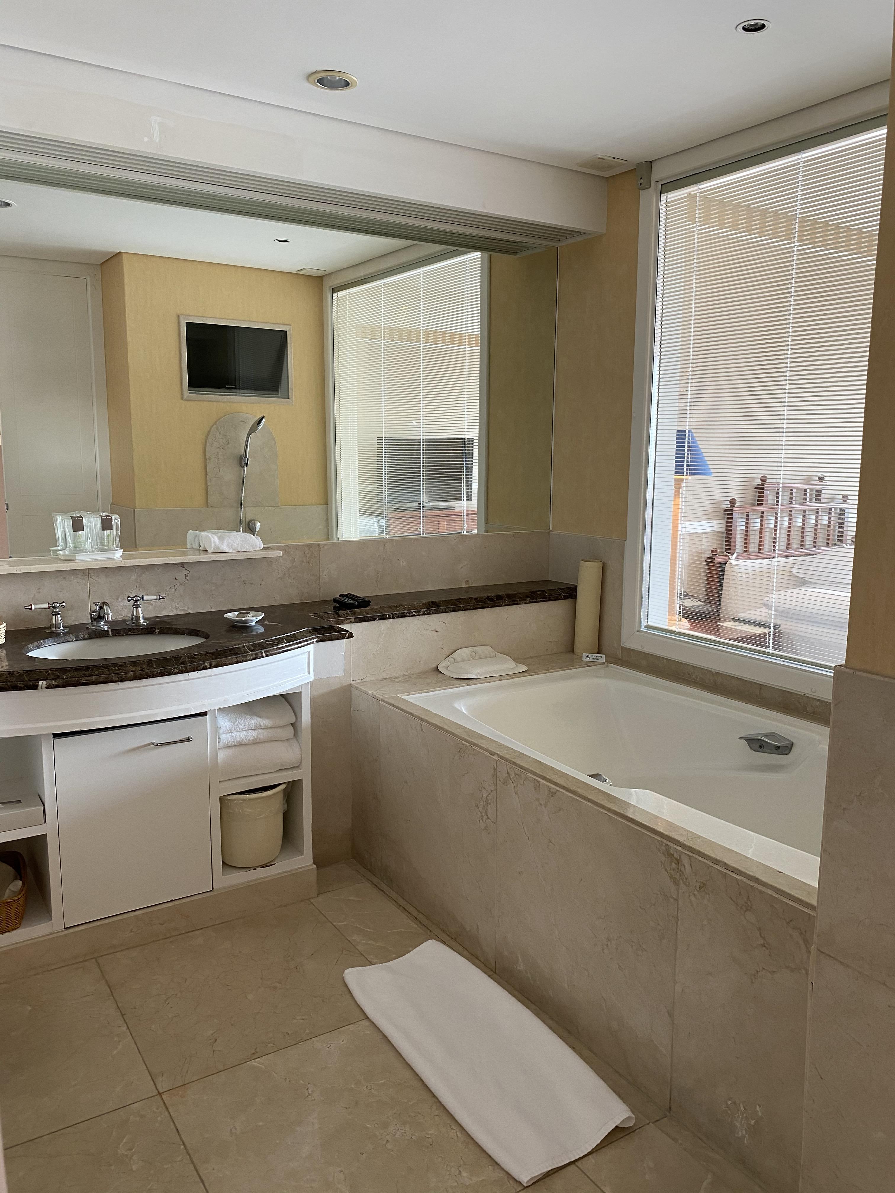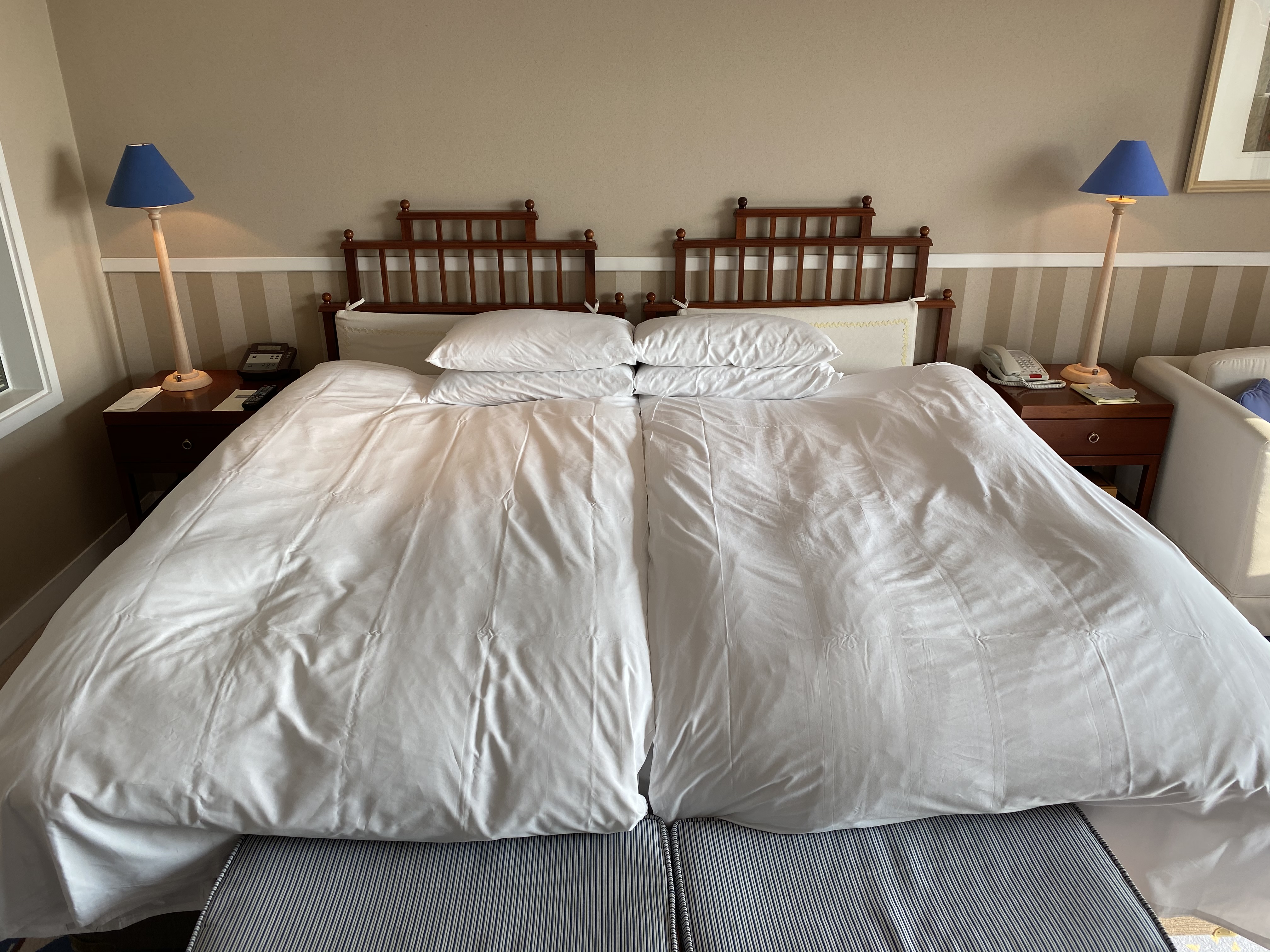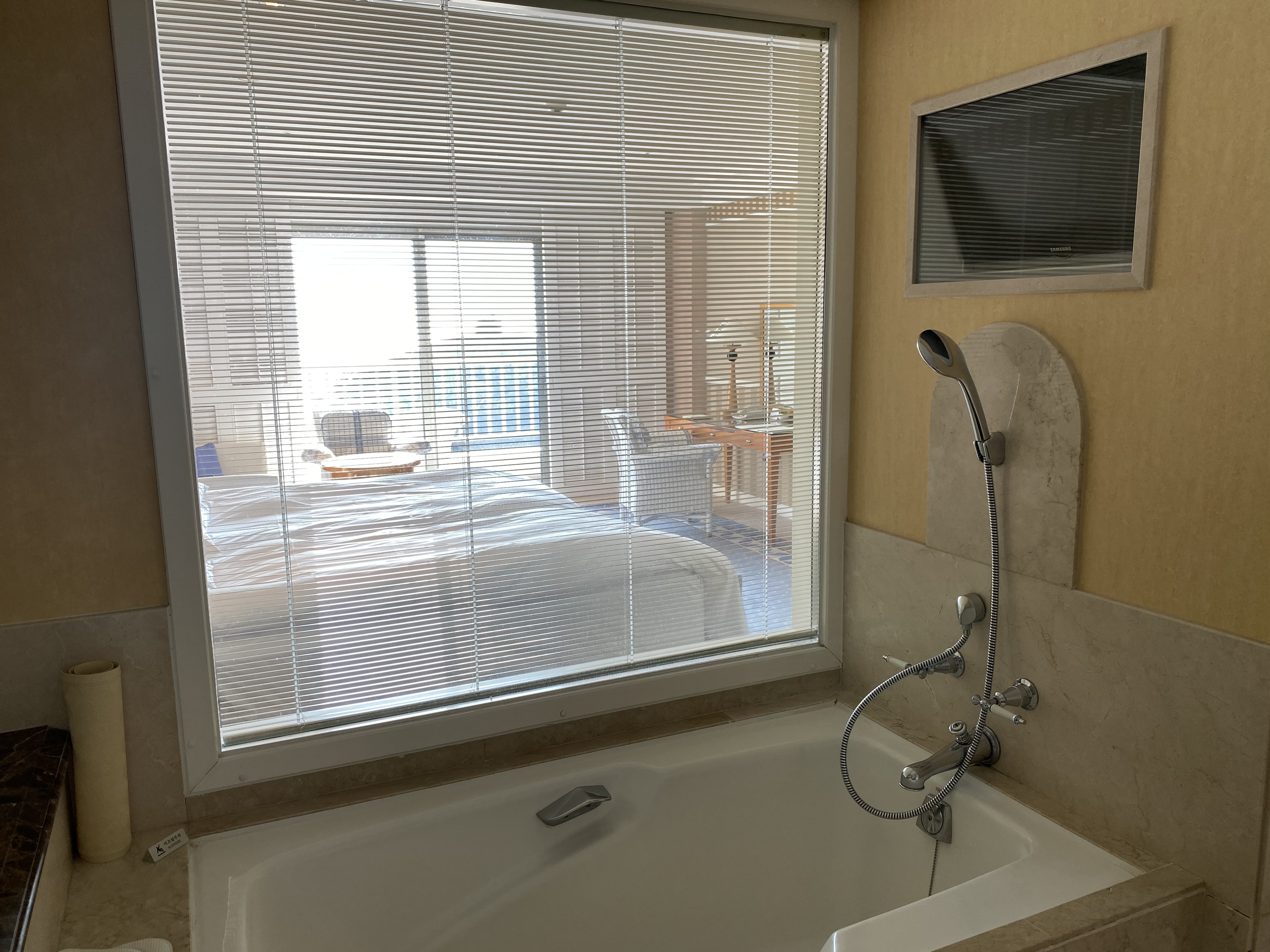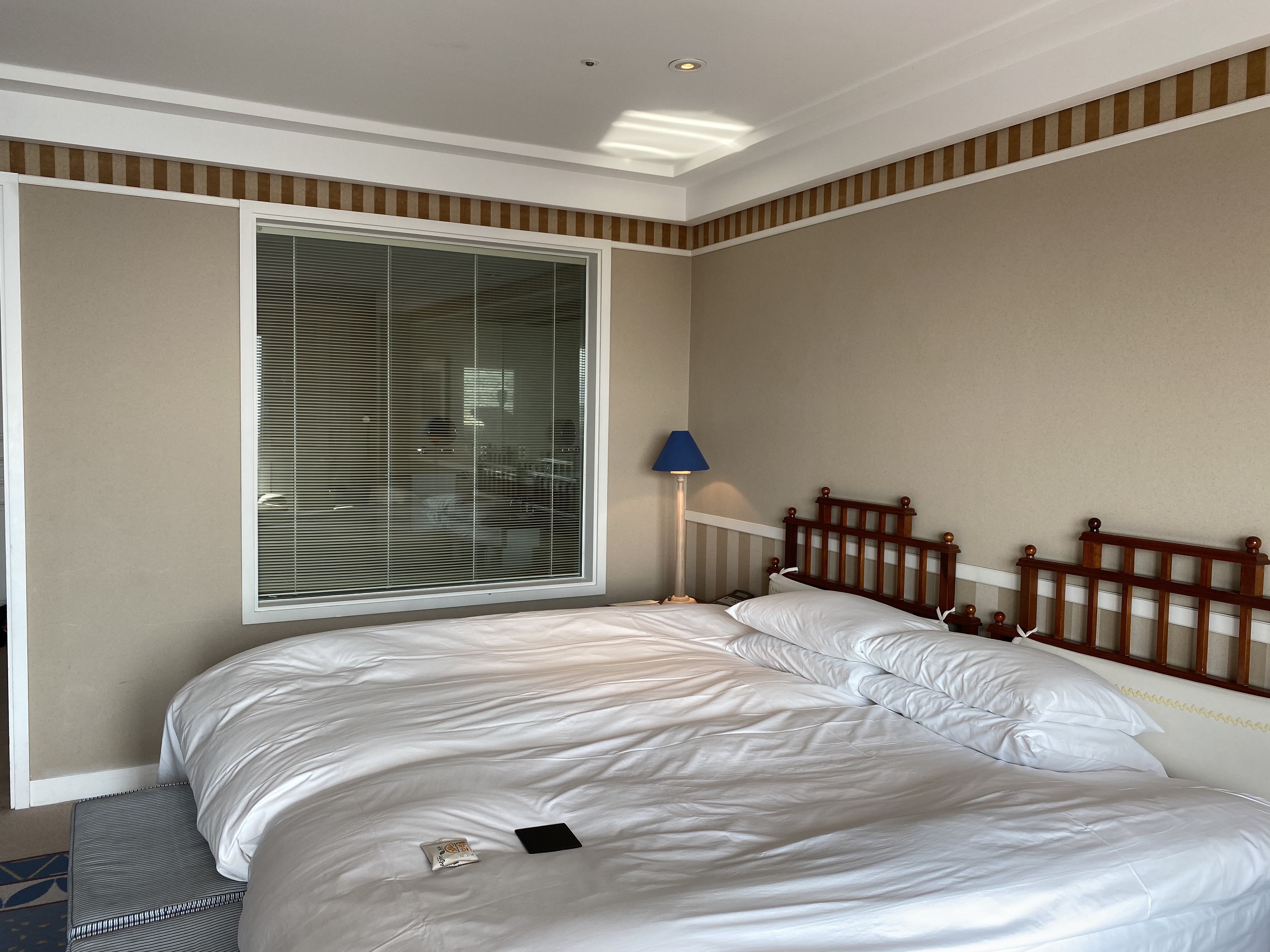 화장실 이야기를 조금 더 하자면, 욕조에 누워서 커튼을 펼치면 방 내부도 볼 수 있고 발코니 너머로 풍경도 보인다. 그래서 거품 목욕 같은 것을 하면서 누워서 쉬는 것 자체가 행복이라 말할 수 있겠다. 추가로 가족 단위로 여행을 올 경우 욕조에서 아이들이 어떻게 있는지 다 보여서 상대적으로 편하게 쉴 수도 있다는 장점이 있겠다. 침대 역시 킹사이즈 수준으로 넓고 푹신푹신하고 편했다. 이리저리 왔다갔다 해도 괜찮았고 잘 쉴 수 있었다. 당연한 말인가? 아무튼 다 좋았다. 만약 고민을 하고 계신 분이라면 무조건 가보시라 말하고 싶다. 근데 내 친구의 경우 여기보다 다른 곳이 더 좋았다고 하긴 하더라. 근데 내 생각엔 차라리 비용을 지불할 거면 아예 방 등급을 높여 제대로 즐기는 것이 괜찮지 않을까 싶다. 만족도 차이가 방 등급에 따라 꽤 나뉘는 것 같기도 하다. 그리고 무조건 바다뷰로! 사실 이렇게 뷰를 고집하는 편이 아니긴 한데 여긴 무조건 바다뷰다. 처음엔 어차피 수영장 가서 다 볼 텐데 굳이 그래야 하나 싶었는데 겪어보니 아니었다.