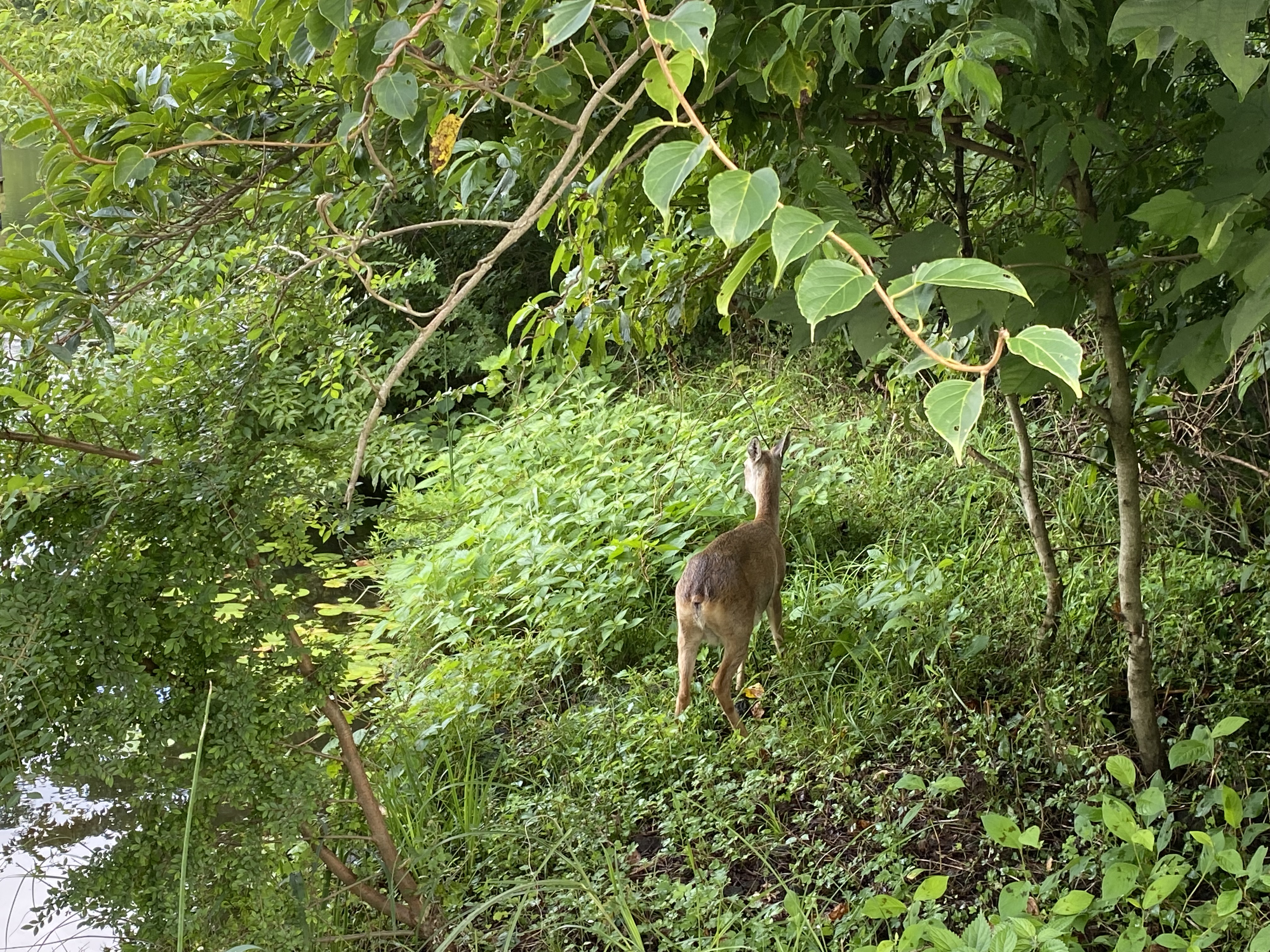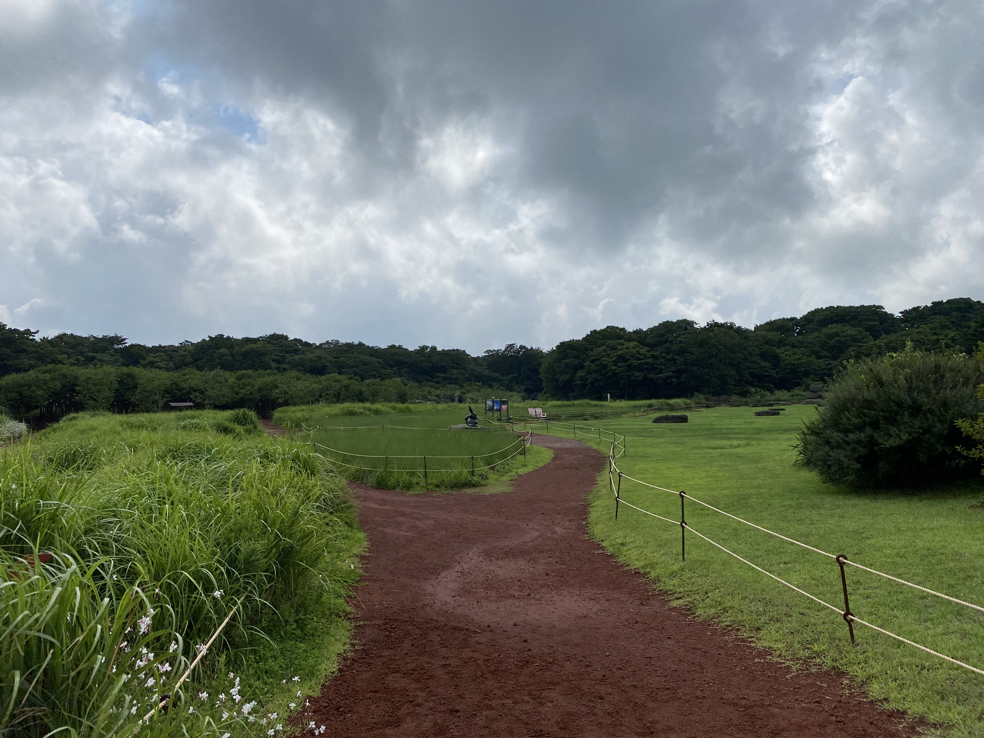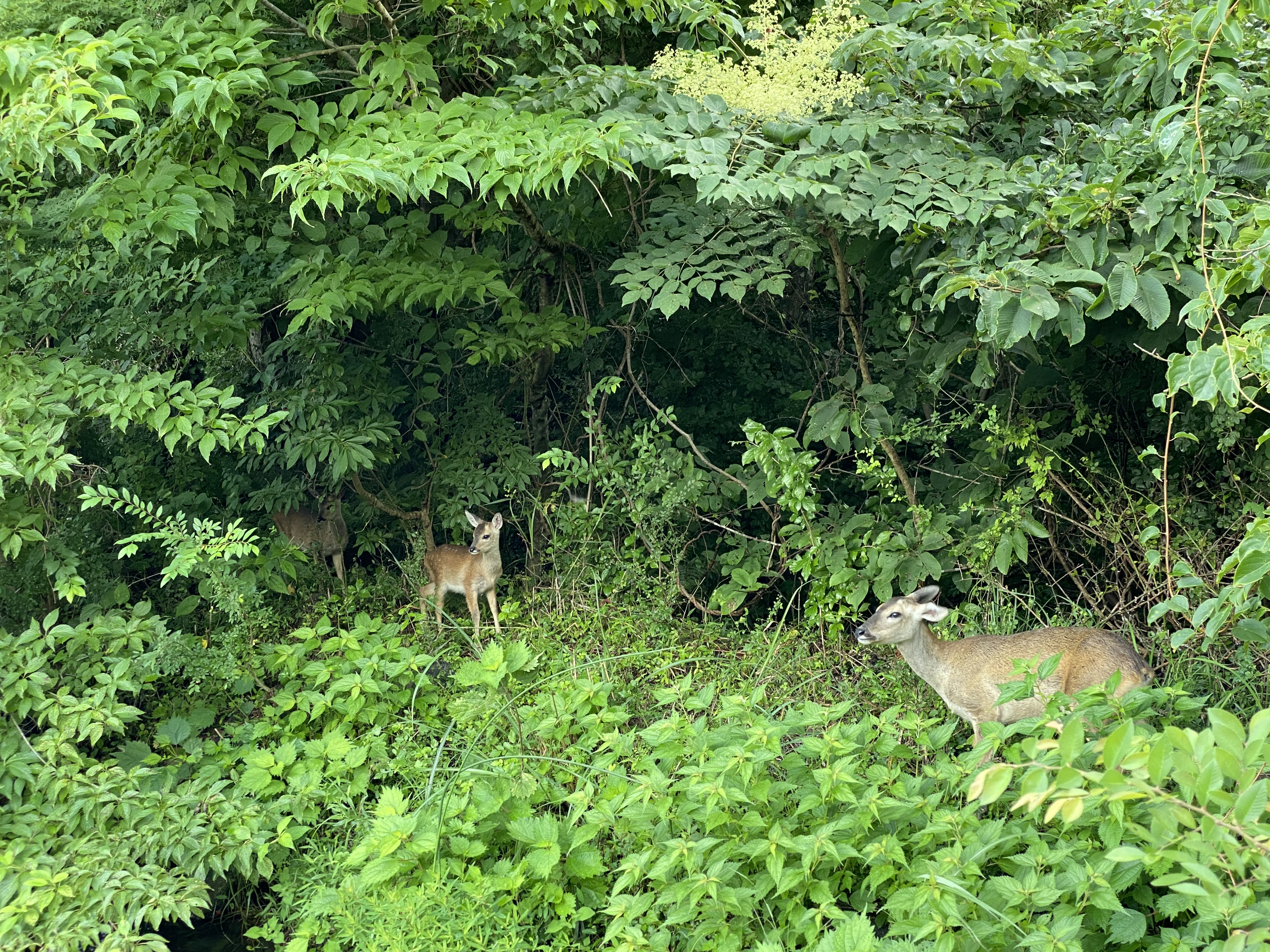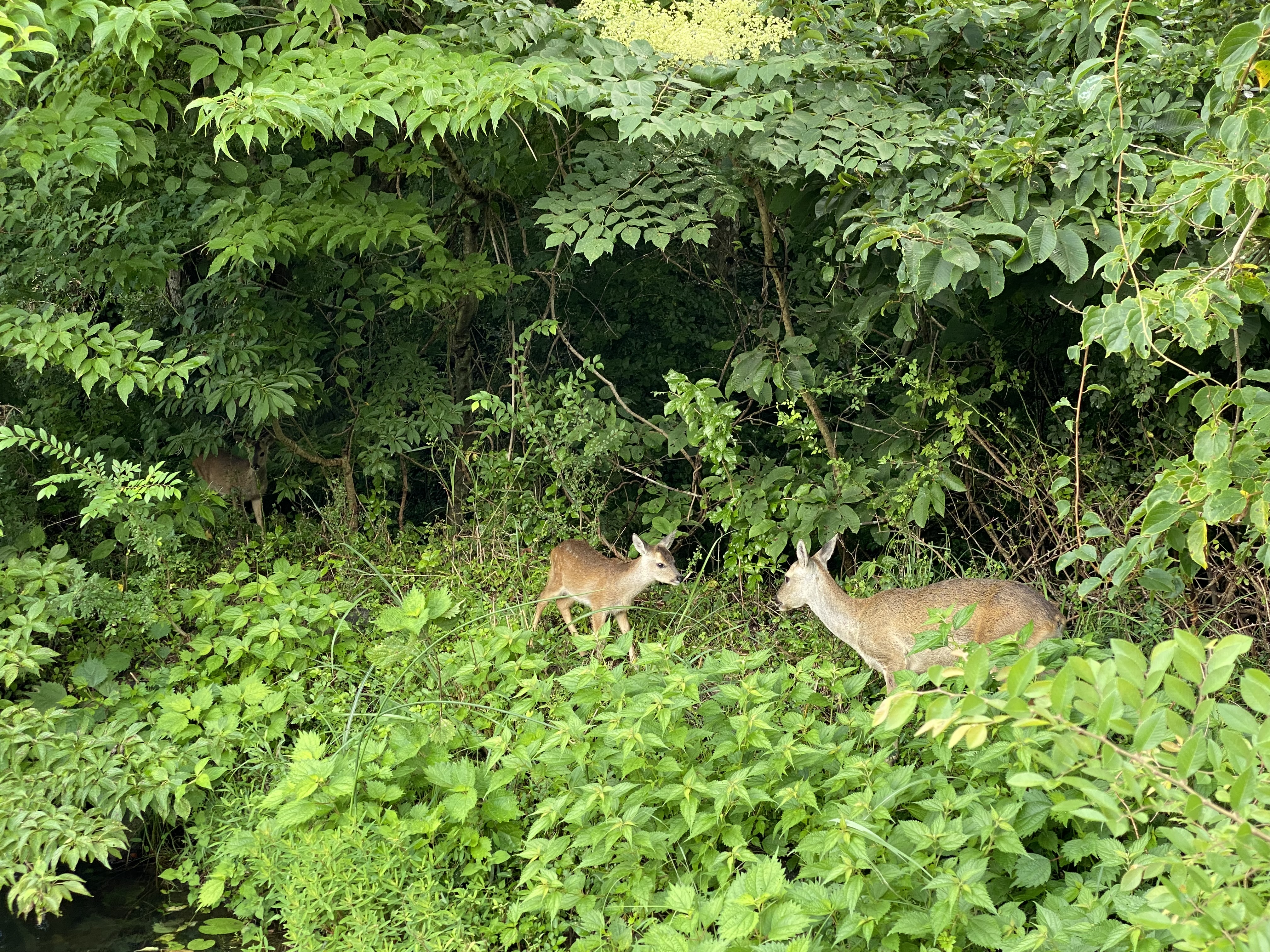 전체적으로 이렇게 자연자연하게 풀숲으로 이뤄져 있다. 다행히 이날은 비가 오지도 않고 날이 좋아 우산 없이 화창하게 걸을 수 있었다. 그리고 대박인 것은 여기에서 자연적으로 생활하고 있는 사슴이라고 해야 하나. 뿔이 없으니 고라니인가. 아무튼 저 가족들을 만날 수 있었다. 풀숲에서 무슨 소리가 나서 보니까 저렇게 모여있었다. 울타리가 있는 것을 아는지 사람이 와도 별로 피하지 않았다. 물론 내가 애초에 가까이 가지도 않았지만. 동물원 같은 곳이 아니라 자연에 저렇게 아기까지 있는 것을 보니 매우 신비하고 뭔가 이상한 감정이 올라왔다.