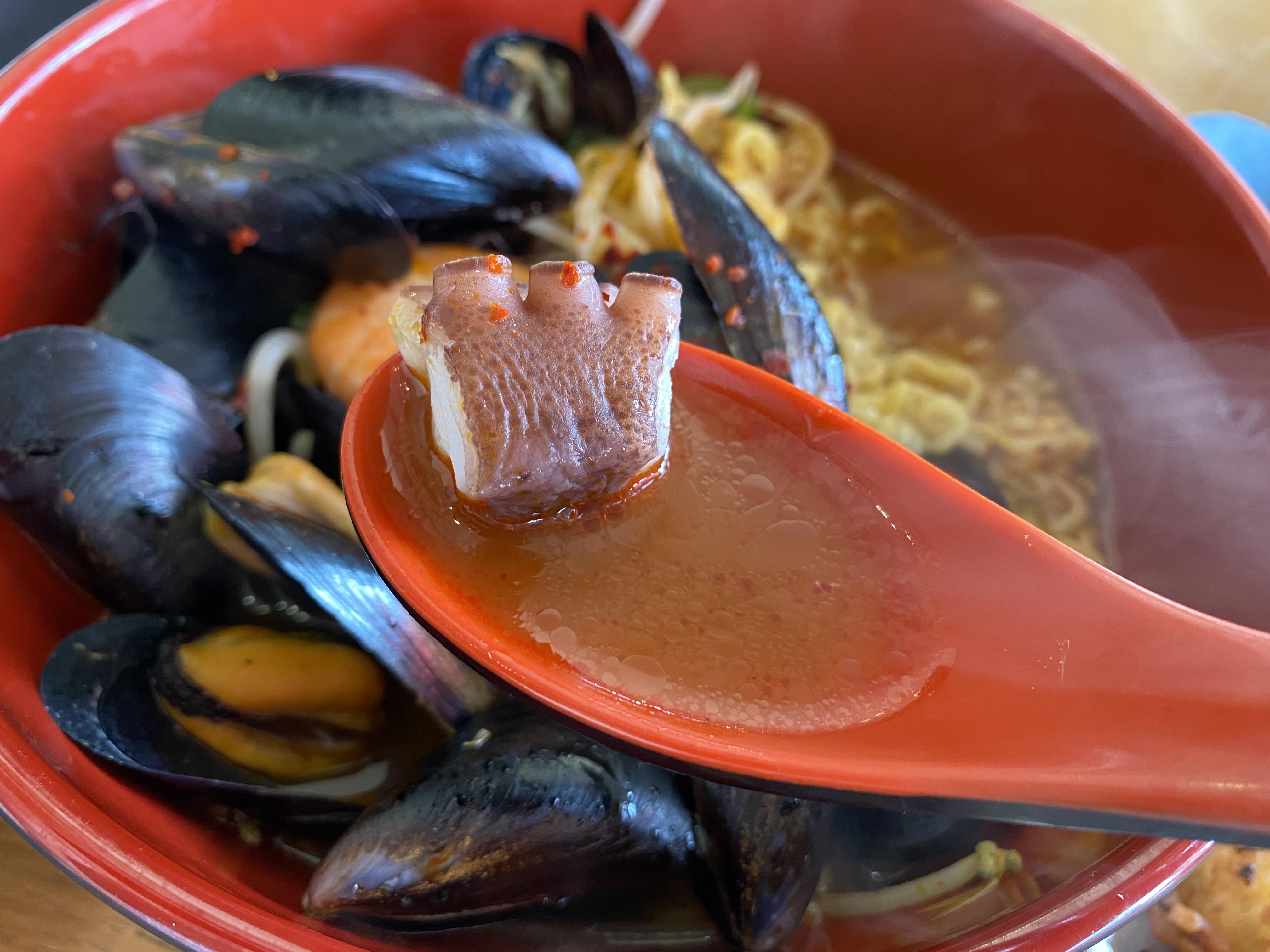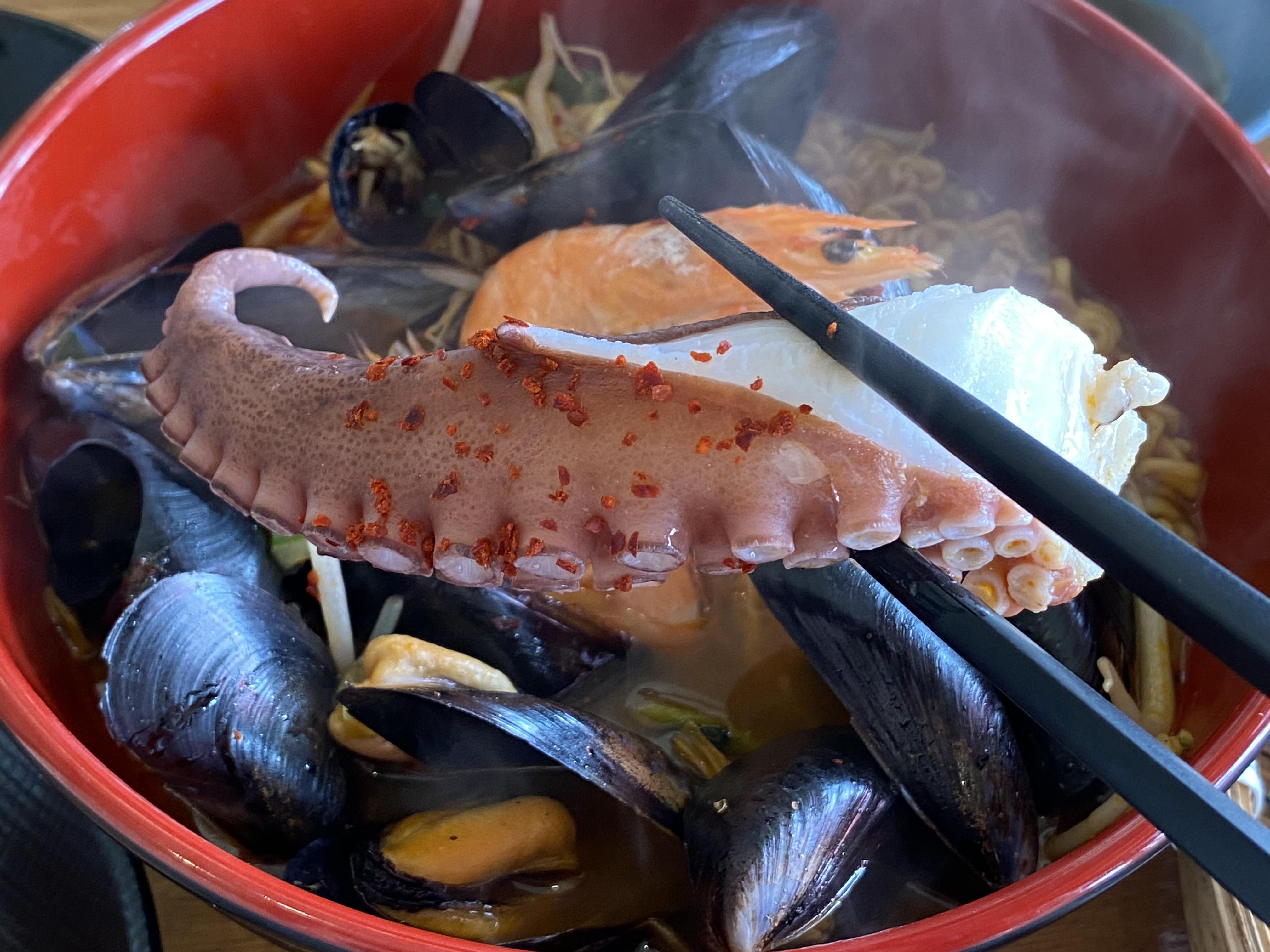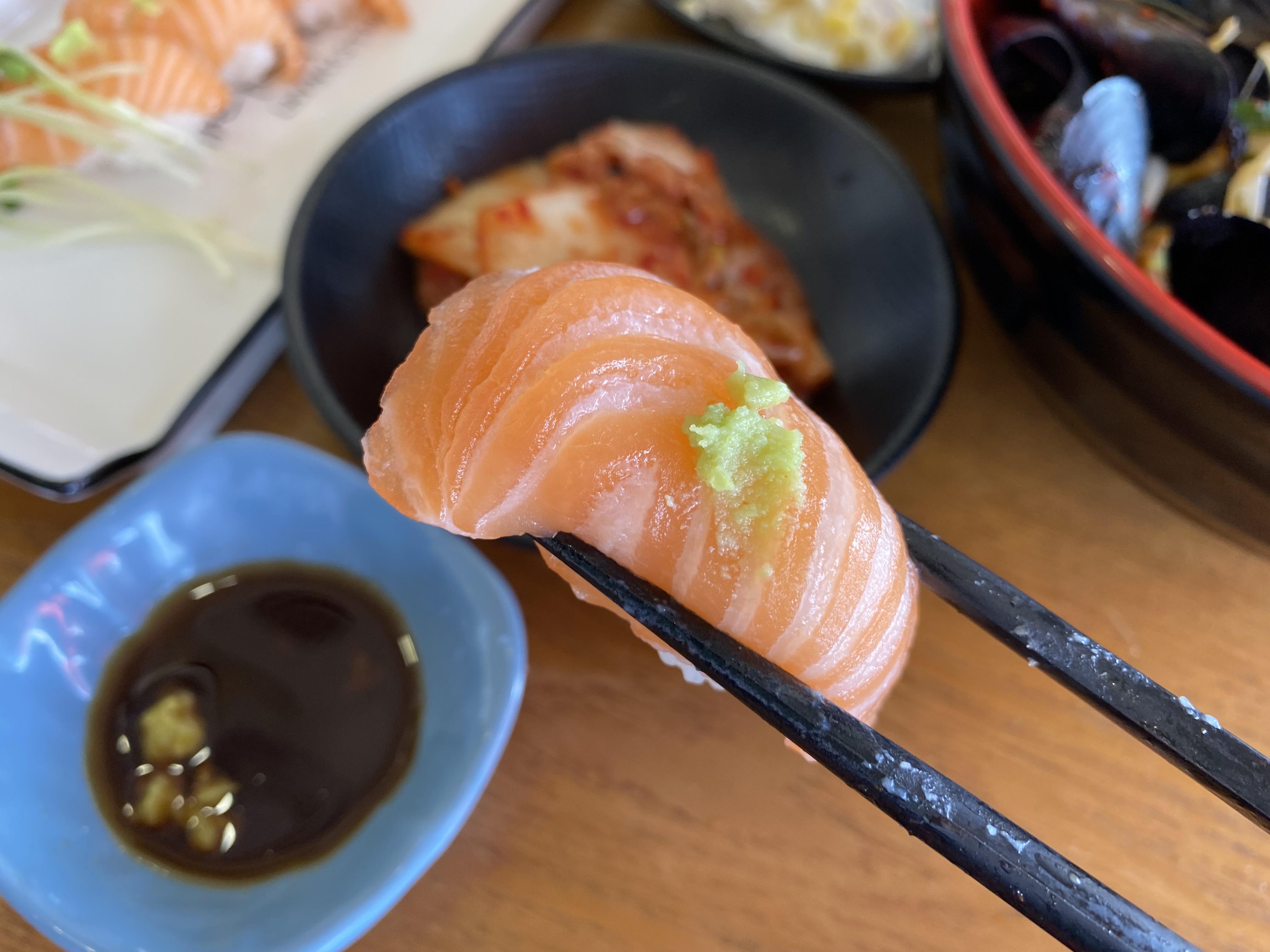 일단 제주도 해물라면 가마라면 안에는 문어, 새우, 홍합, 숙주나물이 들어갔다. 이렇게 문어 다리가 나름 사이즈 크게 들어간 것을 확인할 수 있겠다. 그리고 홍합을 휘휘 저으면 안에 이렇게 면발이 드러난다. 이 면발이 붇기 전에 후다닥 먹어줘야 하기 때문에 먼저 먹었고 그다음 해물이 듬뿍 들어간 겉바속촉 해물파전을 먹었다. 그리고 마지막으로 나름 급하게 먹어줘야 하는 연어 초밥을 곁들여줬다. 이렇게 주문하니 구성이 정말 딱 맞았다. 튀김요리의 바삭함은 해물파전에서 찾고 나름 탄수화물 공급과 부드러움은 초밥에서 찾고, 마지막으로 모든 느끼함을 잡아줄 수 있는 부분은 얼큰한 해물라면으로 해결하고 말이다. 전체적으로 조합이 너무 좋았고 비주얼도 좋고 가격도 착하고 맛도 좋았다. 우연히 찾아온 가게가 뜻밖의 큰 선물을 준 날이었다.