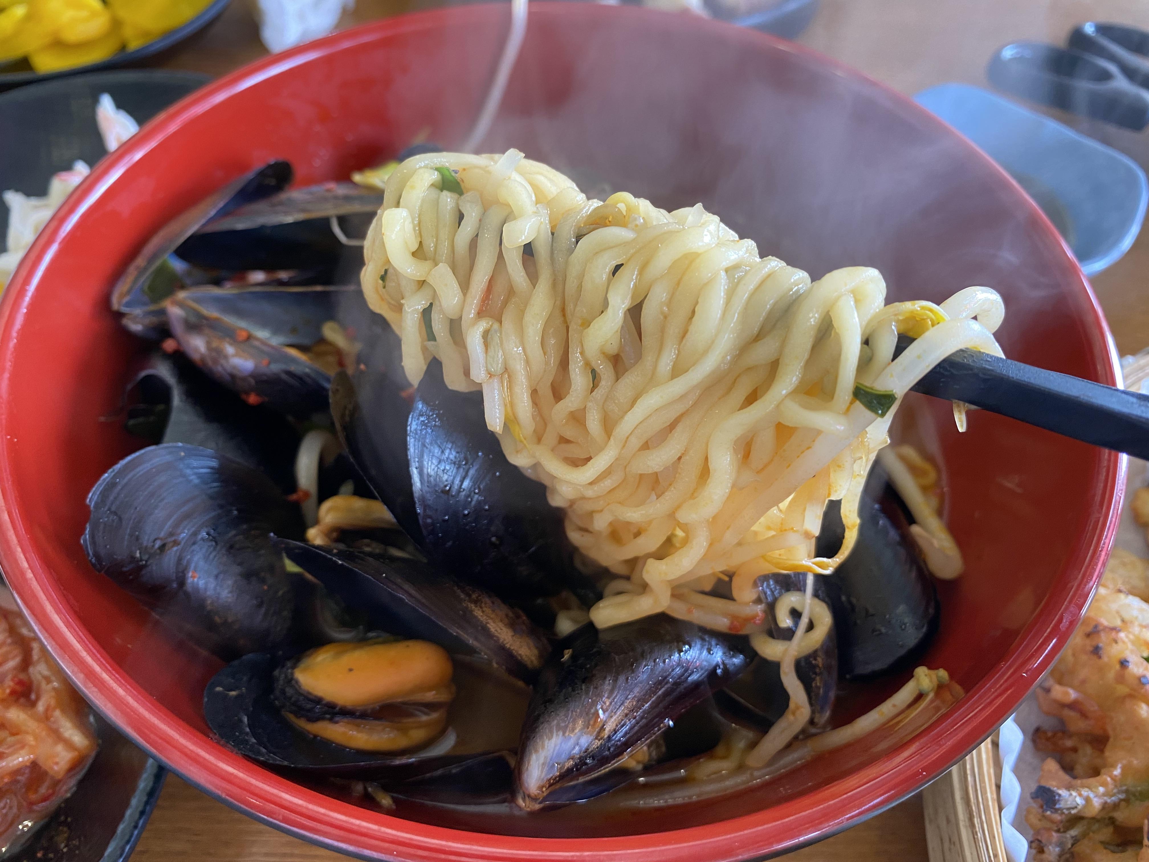 갑자기 이 포스팅을 하면서 군침이 돈다. 그만큼 맛있었다. 웬만하면 어딜 가라고 강력하게 말하지 않는 편인데 여긴 정말 추천한다. 그리고 내심 좀 입소문이 났으면 하는 가게다. 정말 뭔가 실력이 있는 느낌인데 덜 알려진 것 같다. 물론 내가 한번 방문했기 때문에 여기가 어떤 분위기고 사람들에게 맛집이라 소문이 났는지 안 났는지 잘 판단할 순 없겠지만 내 기준으로 너무나 만족스러웠다. 우연히 발견하게 되어서 괜히 기쁨이 배가 되었나? 그랬을 수도 있겠다. 뭔가 딱 적절한 타이밍에 괜찮은 곳을 발견하게 된 것이니 말이다. 그렇다 보니 좀 급하게 먹게 되었고 이렇게 가마라면은 벌써 바닥을 드러내기 시작했다. 근데 정말 해산물이 실하게 들어가 있어서 나름 골라먹는 재미도 있고 국물 시원하고 맛있었다. 이런 맛은 정말 제주도에 와야 맛볼 수 있는 맛 중 하나가 아닐까 싶다.