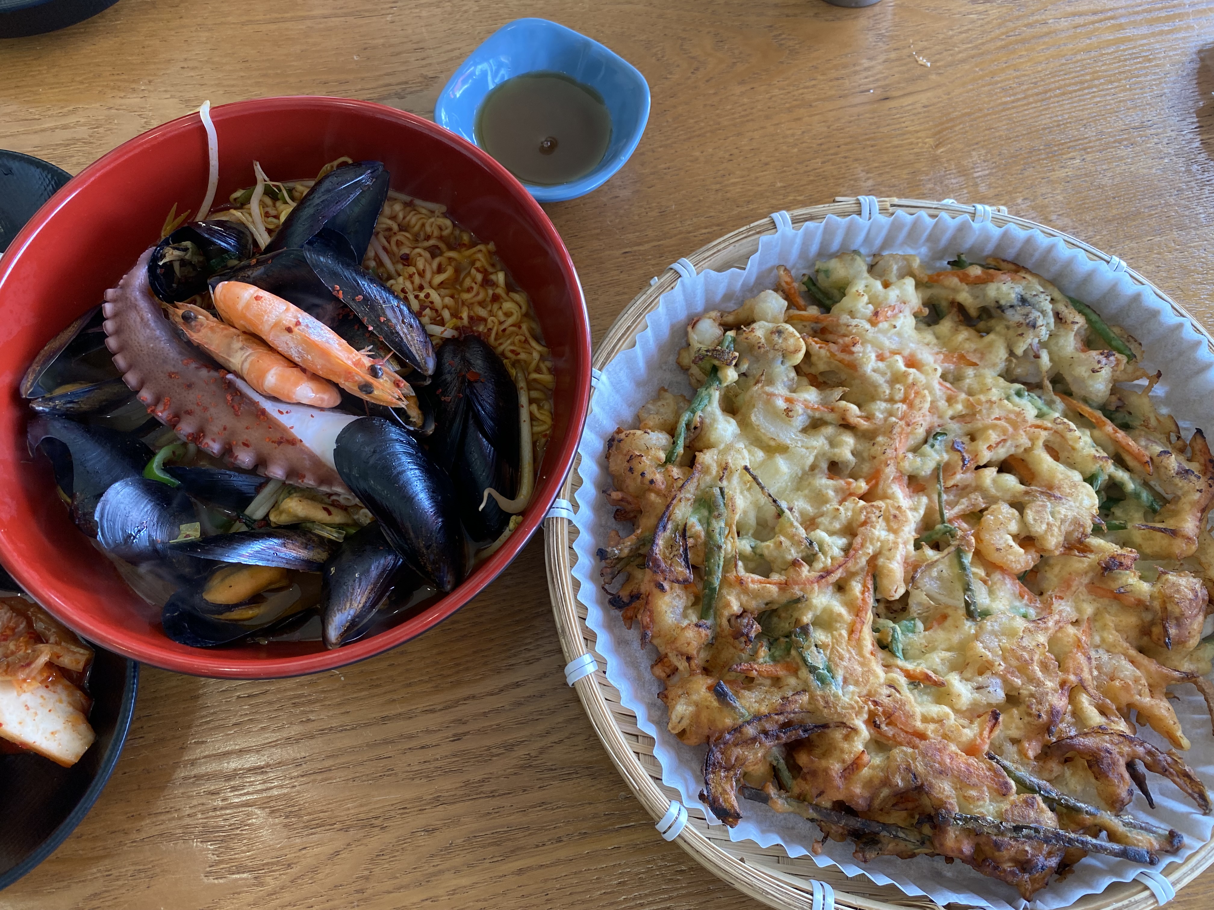 여기 처음 구조가 꽤나 신기했다. 초밥집과 라면집이 두 개가 각각 있고 연결된 구조였다. 사장님께서 상호명을 다르게 가져가면서 동시에 운영하시는 것 같았다. 약간 샵인샵 느낌으로? 처음에 그래서 주문을 어떻게 해야 하지 하다가 사장님께서 초밥류도 주문이 가능하다고 하셔서 연어를 추가로 주문하였다. 그래서 라면 자체도 조금 더 비싼 해녀로 도전할까 하다가 이렇게 그냥 가마라면으로 주문했다. 연어 초밥이 추가로 나오니 이것만으로도 충분할 것 같았다. 그리고 이 해물파전 자체가 가격이 좀 나가서 양이 상당히 많을 것 같아 이 정도 주문해도 충분히 배불리 먹을 수 있을 것 같았다. 정말 여긴 평점도 보지 않고 우연히 들렸기 때문에 순전히 맛이나 퀄리티는 운에 맡겨야 했다. 근데 먹기 전부터 좋은 징조들이 조금씩 보이기 시작했다.