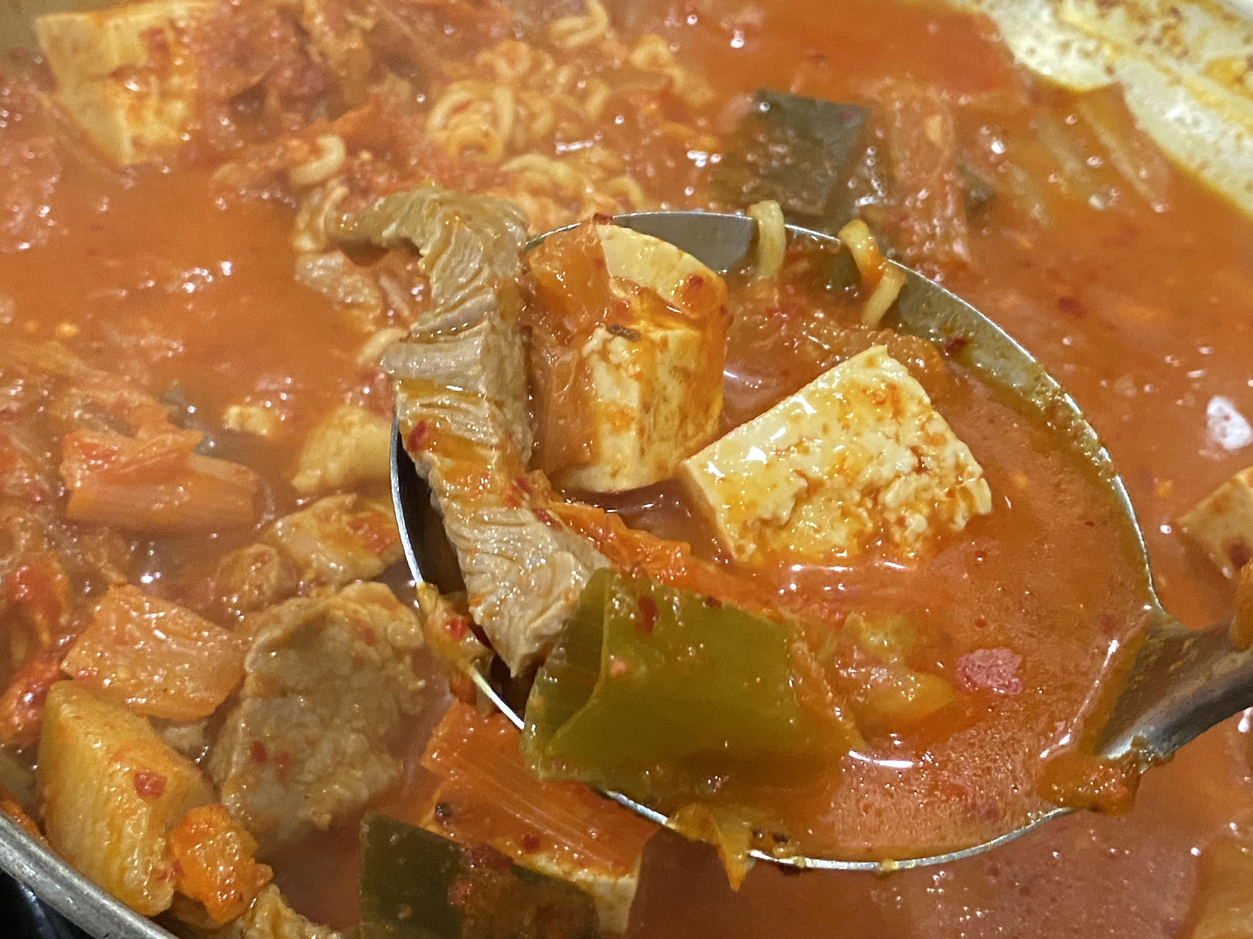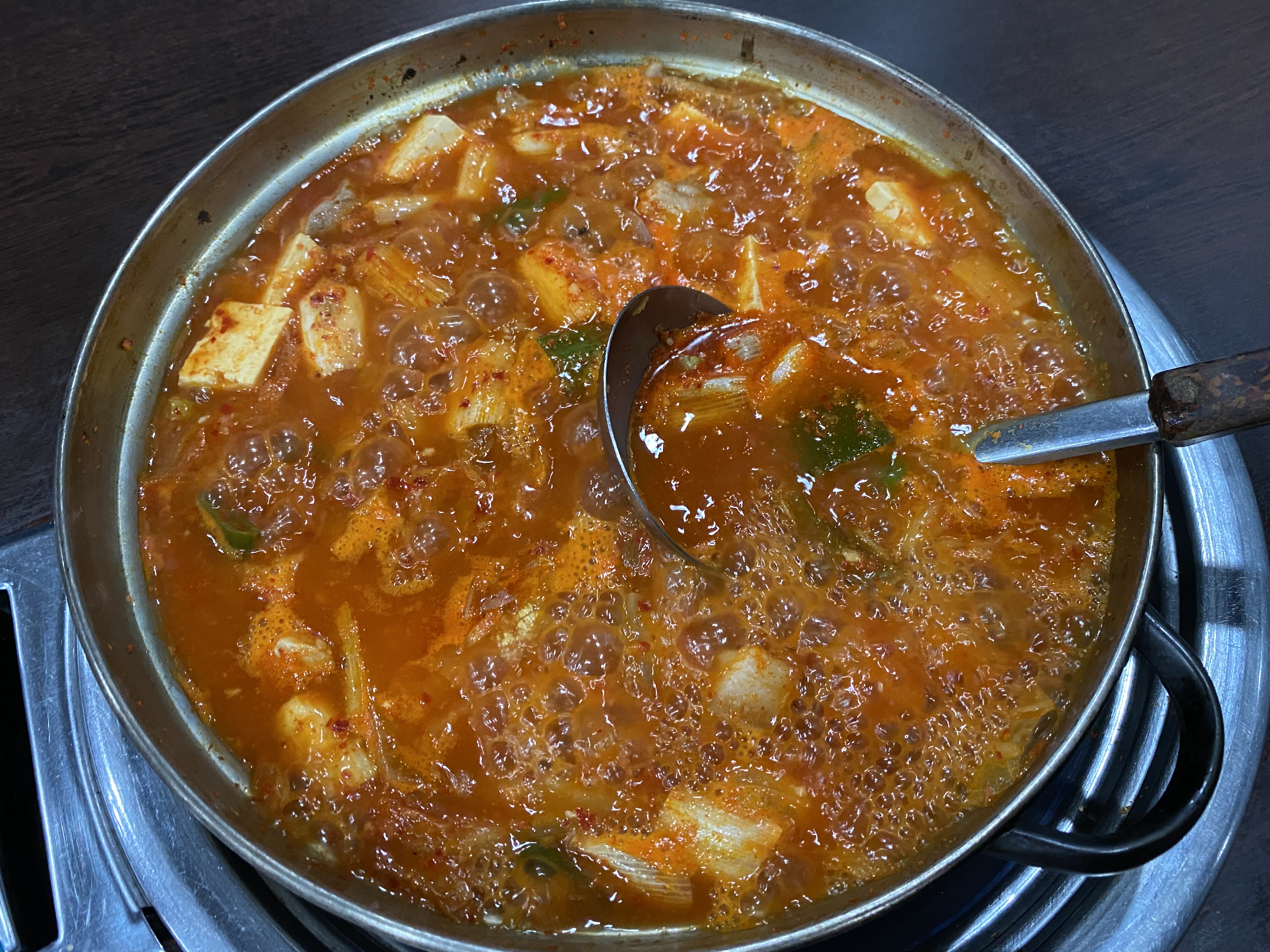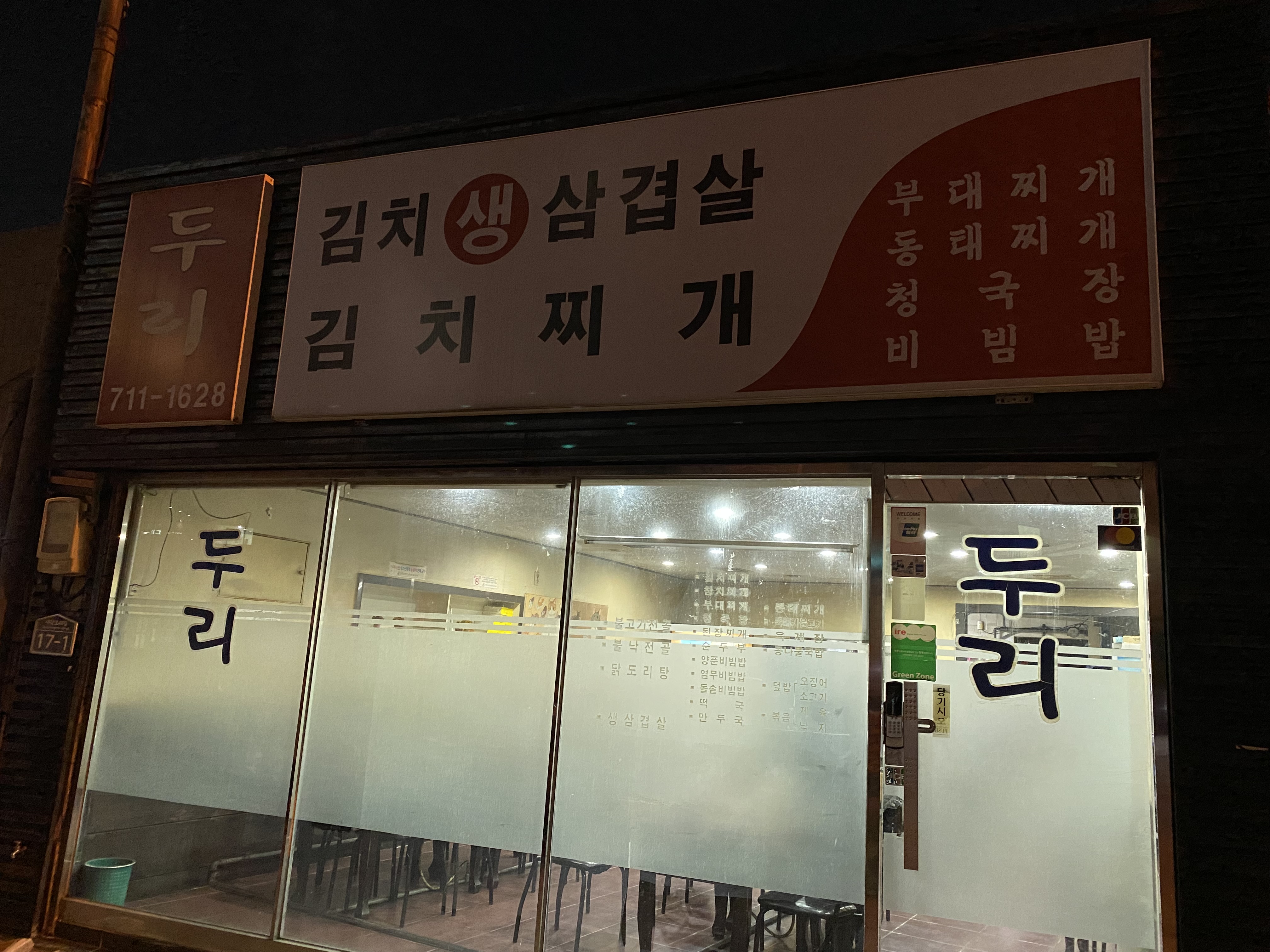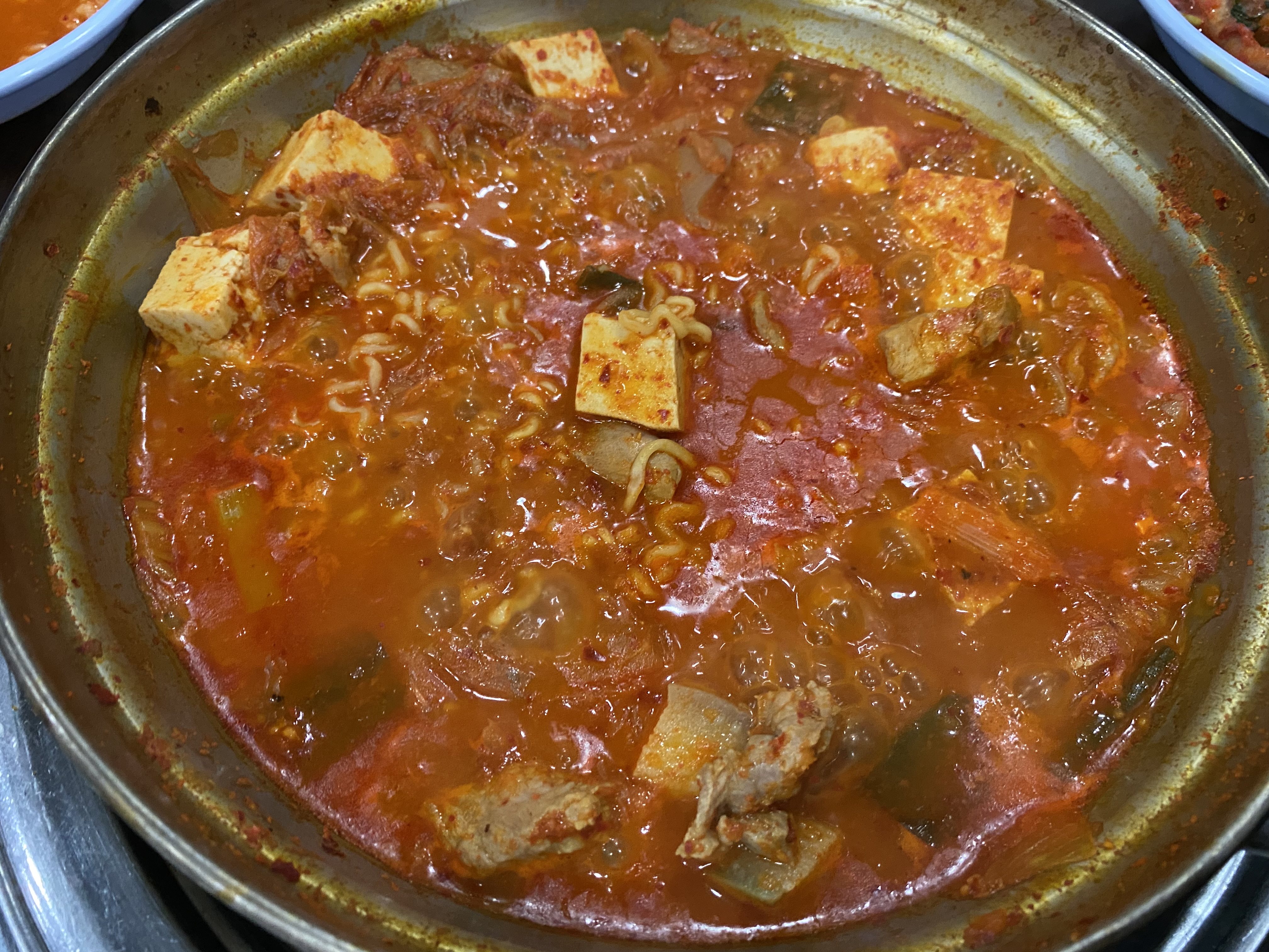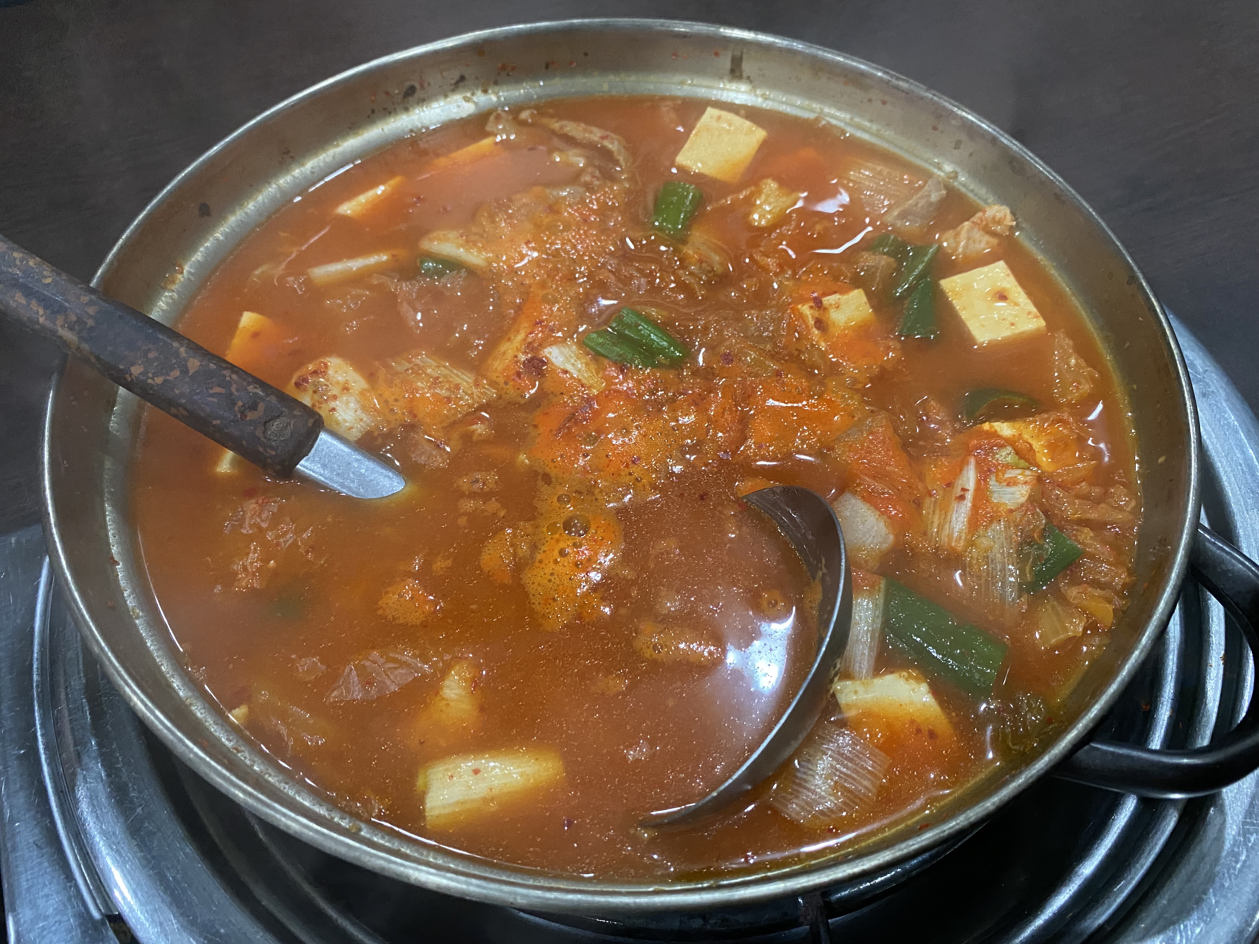 원래 평소에 두부도 잘 안 먹는 편인데 이날은 두부도 좀 먹었다. 원래 두부를 먹으면 포만감이 올라와서 차라리 밥을 한숟갈 먹는 편인데 여긴 국자로 한 번씩 푸면 이렇게 고기와 두부가 같이 올라와서 골라먹기도 뭐하고 그냥 같이 먹었다. 그리고 김치가 맛있어서 따로 찬에 올라온 김치를 따로 먹어봤는데 그냥 찌개 안에 들어가 있는 김치가 더 맛있었다. 이미 저 맛에 빠져서 다른 맛은 미각에서 못 느끼고 있는 상태였다. 이렇게 친구와 기대하지 않았던 맛있는 저녁 식사를 했다. 그리고 친구는 킥보드, 나는 따릉이를 타고 집으로 돌아왔다. 식후 운동까지 꽤나 만족스러웠던 하루다. 두리분식, 이미 용산 전자상가에 일하는 사람들은 다 알고 있는 그런 가게지만 충분히 매력 있는 가게다.