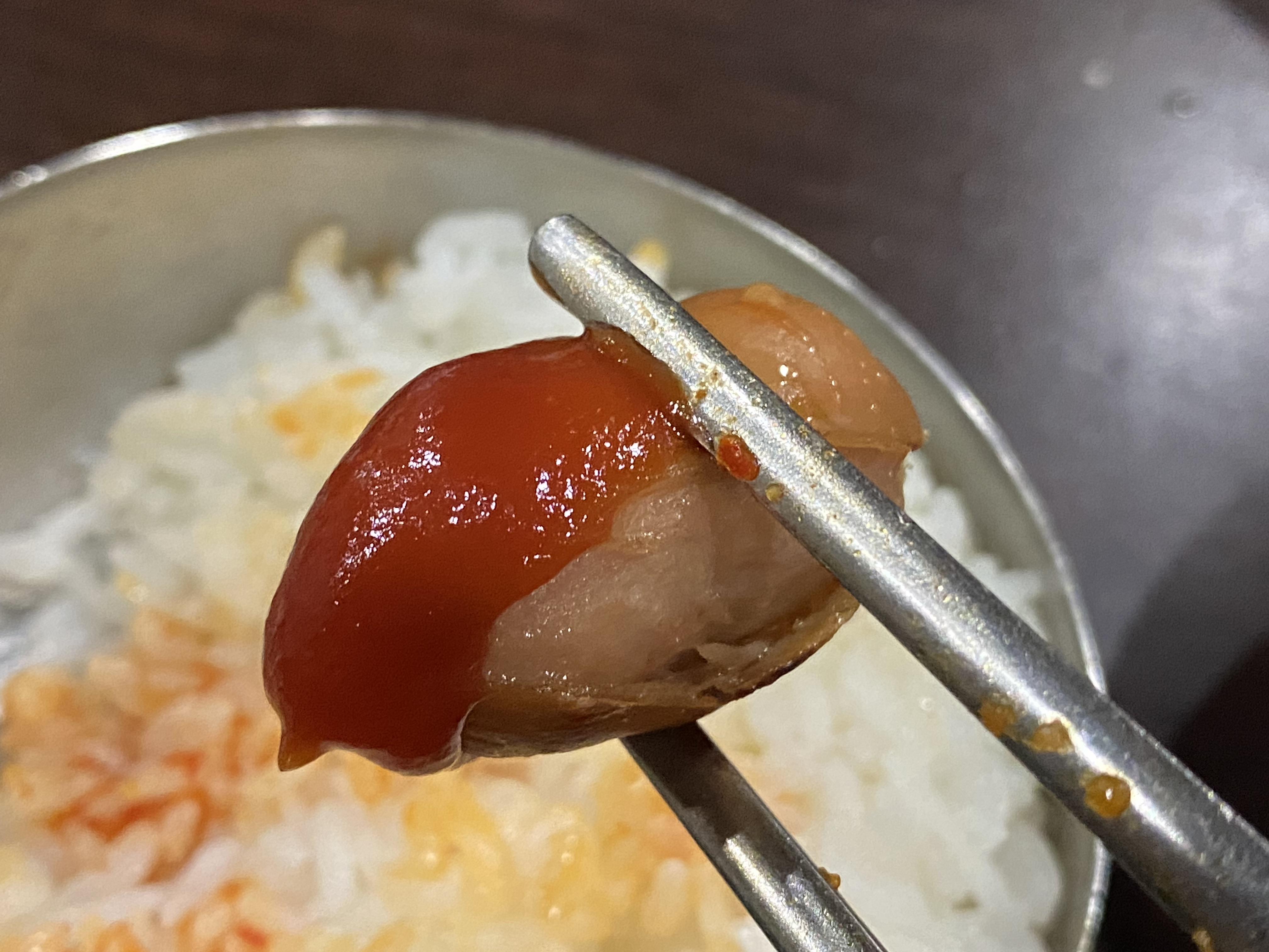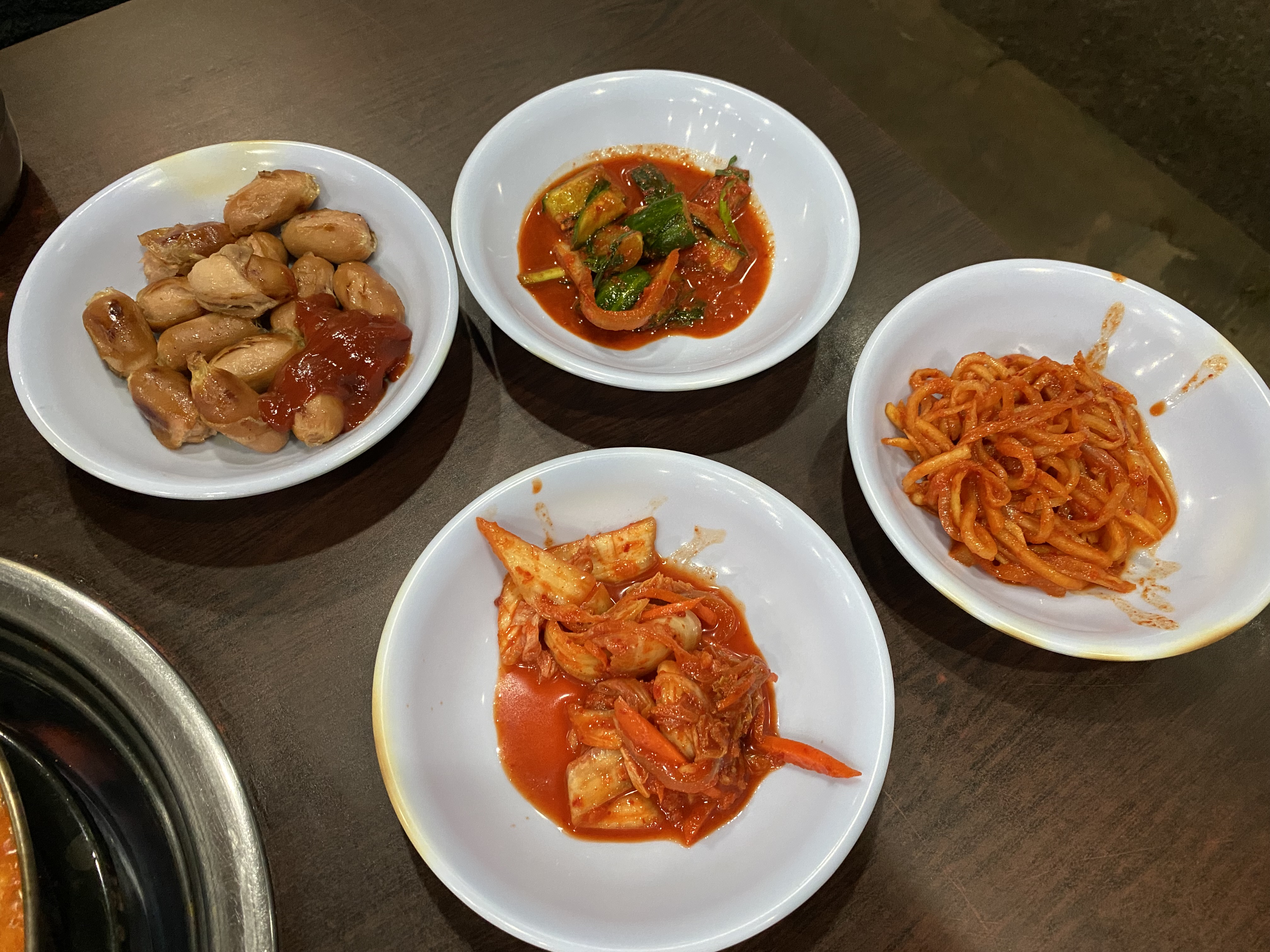 처음부터 먹어도 되는 것 같긴 하지만 조금 더 보글보글 끓기를 기다렸다. 고기가 좀 허옇게 보이기도 하고 그냥 국물이 좀 졸아서 더 짭조름하게 먹고 싶었다. 진짜 짠 음식도 좀 줄여야 하는데 너무 좋아한다. 그래도 나름 짠 음식을 줄여가고 있다. 그리고 뒤이어 밑반찬들이 나왔다. 확실히 동네에 있는 가게와 다른 점 하나는 약간 백반은 아니지만 그런 스타일로 나온다는 것이다. 밑반찬으로 저 소세지를 받아본 적이 언제인지 기억도 나지 않는다. 케첩도 같이 나오고. 바로 하나 먹을 수밖에 없었다. 흰쌀밥도 좋고. 분명히 오기 전엔 별로 먹을 생각도 나지 않았는데 이렇게 비주얼을 보니 들어가긴 들어간다. 뭐 어떻게든 살아가긴 하나보다.