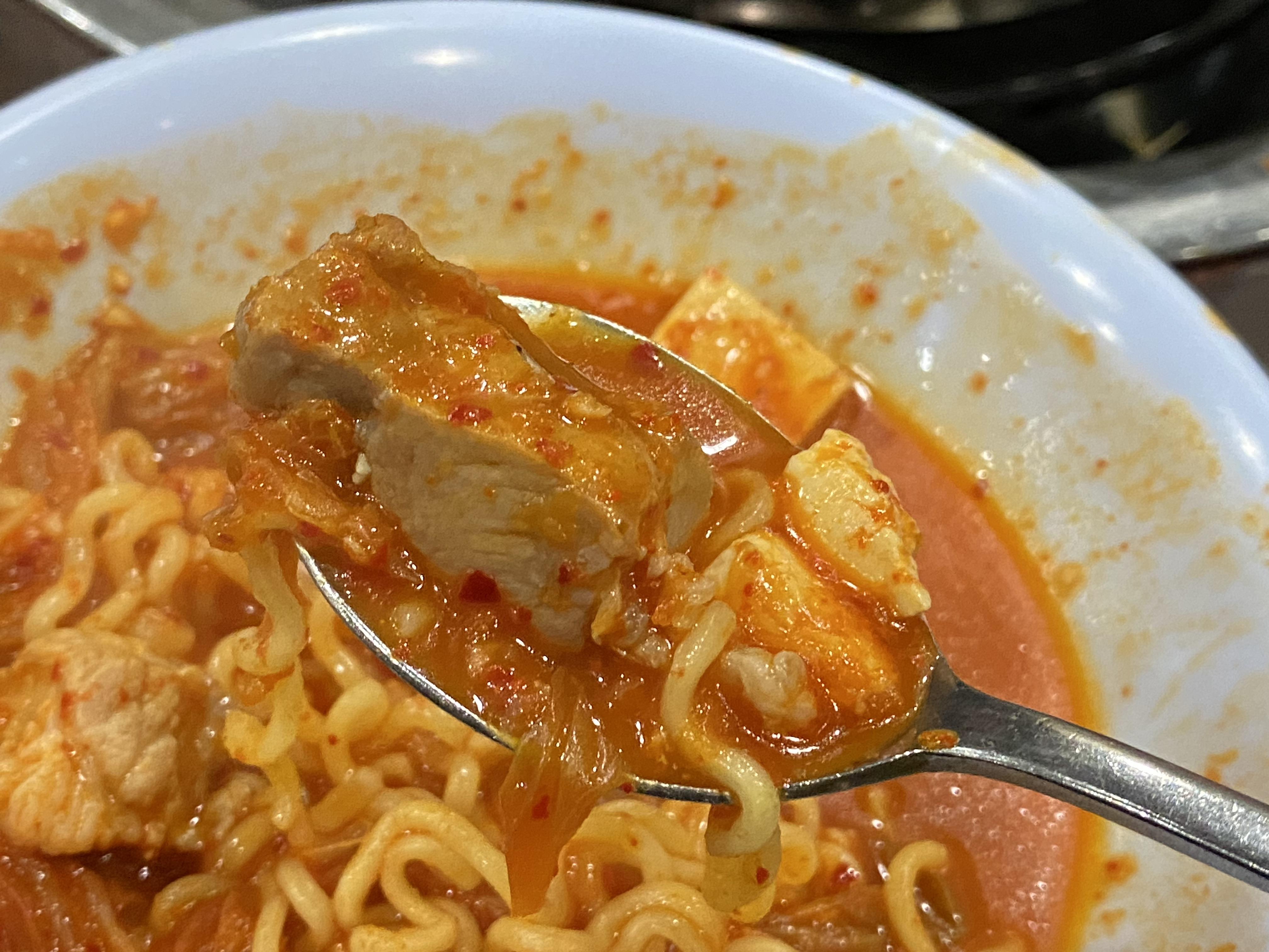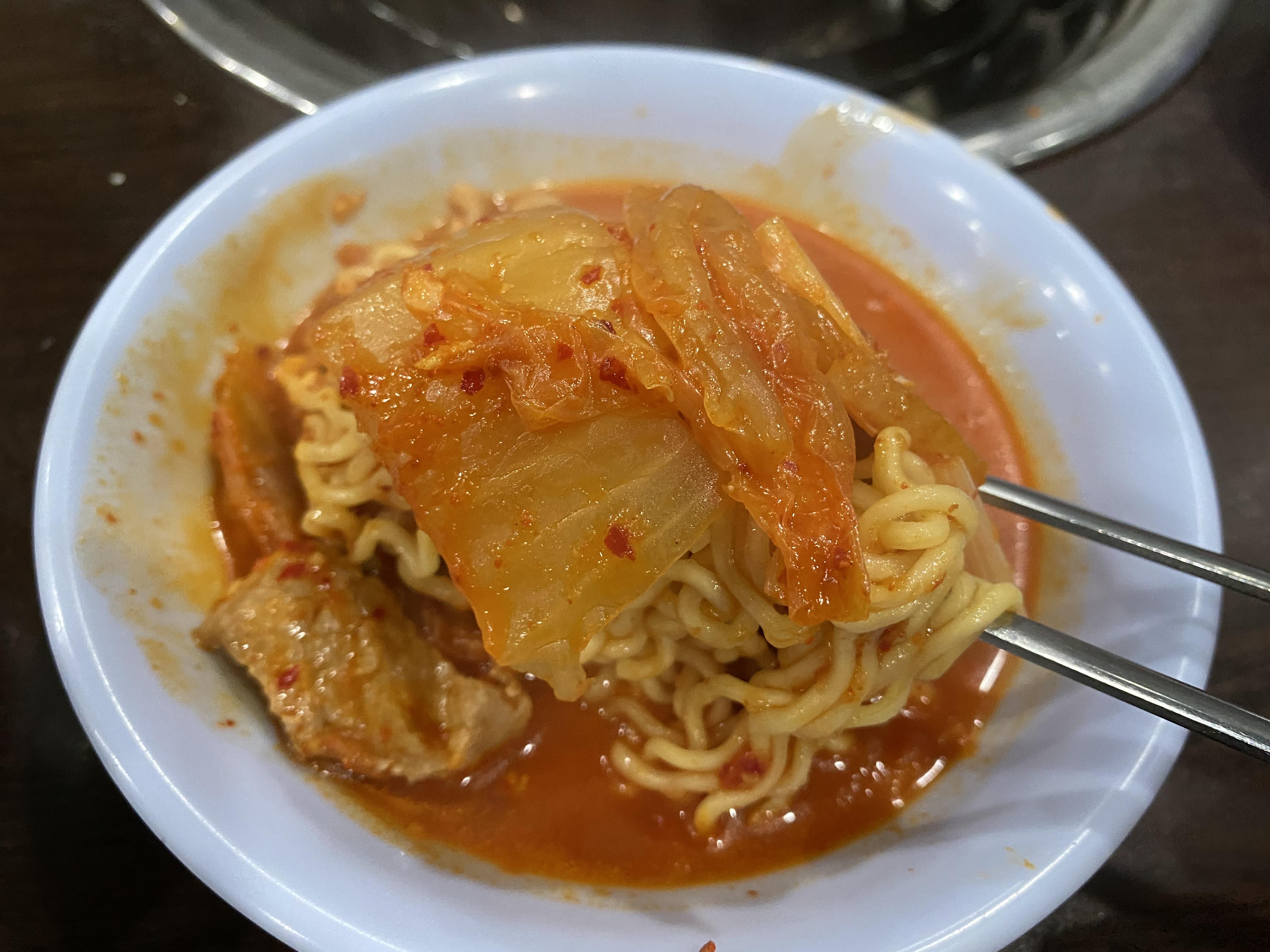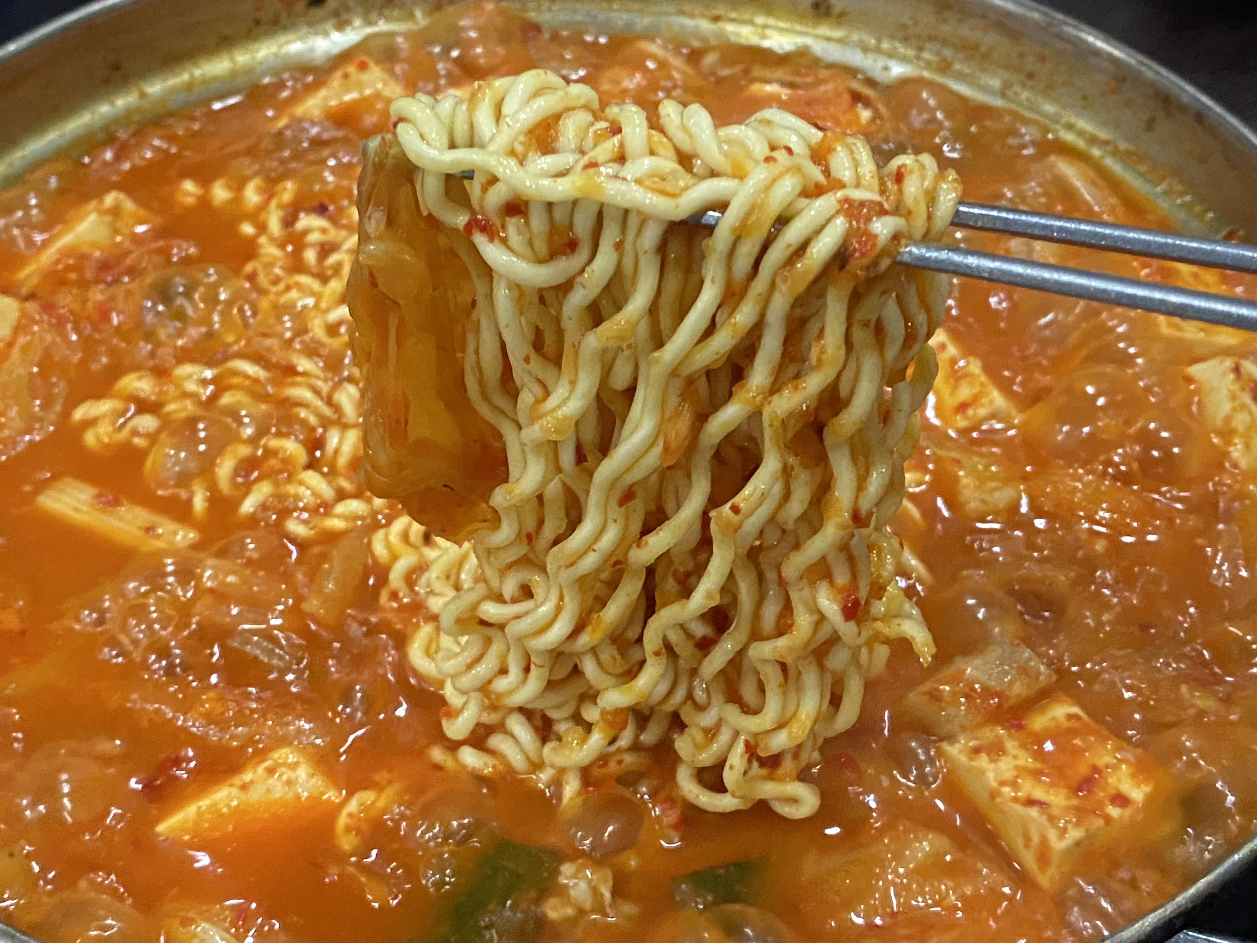 하나 추가한 라면사리가 적당히 다 익어가는 것 같았다. 그리고 덜 익었다고 하더라도 이때 한번 먹어야 그 다음 한 젓가락이 퍼지지 않고 먹을 수 있겠다. 꼬들한 면이 처음엔 좀 거부감이 들 수 있는데 뭔가 이상하게 매력 있다. 꼬들면이라는 표현도 누가 처음 말한 건지 갑자기 대단하게 느껴진다. 기본적으로 아까부터 강한 불로 끓였기 때문에 면발 안에도 간이 배어있겠다. 여기에 사장님이 라면수프를 넣으셨는지 안 넣으셨는지는 모르겠지만 기본적으로 면만 먹더라도 간이 딱 알맞게 맛있었다. 이게 정말 익숙한데 맛있는 그런 맛이다. 비주얼은 그냥 집에서 먹는 정감 가는 비주얼인데 맛 역시도 그렇다. 다만 수고스러움이 안 들어가는데, 이 가격이면 합리적으로 맛있게 즐길 수 있는 맛이랄까.