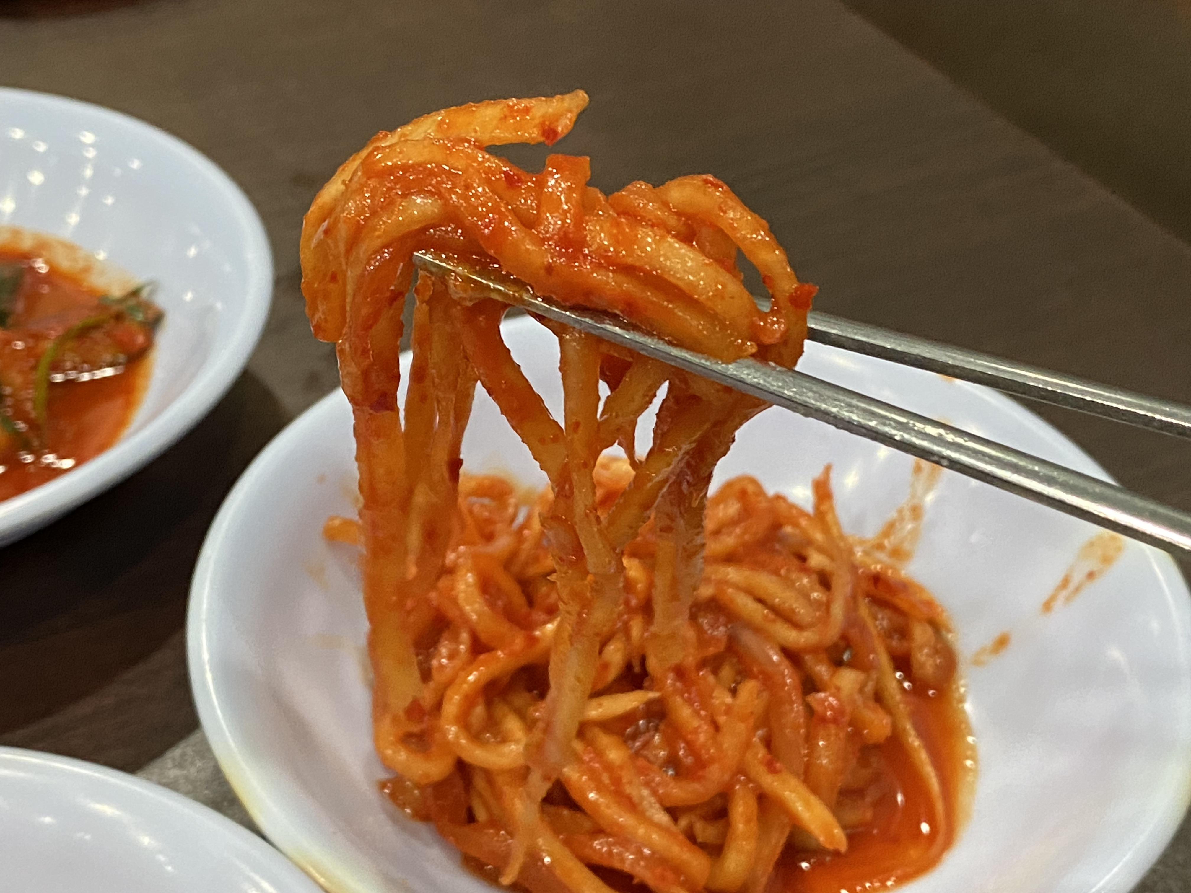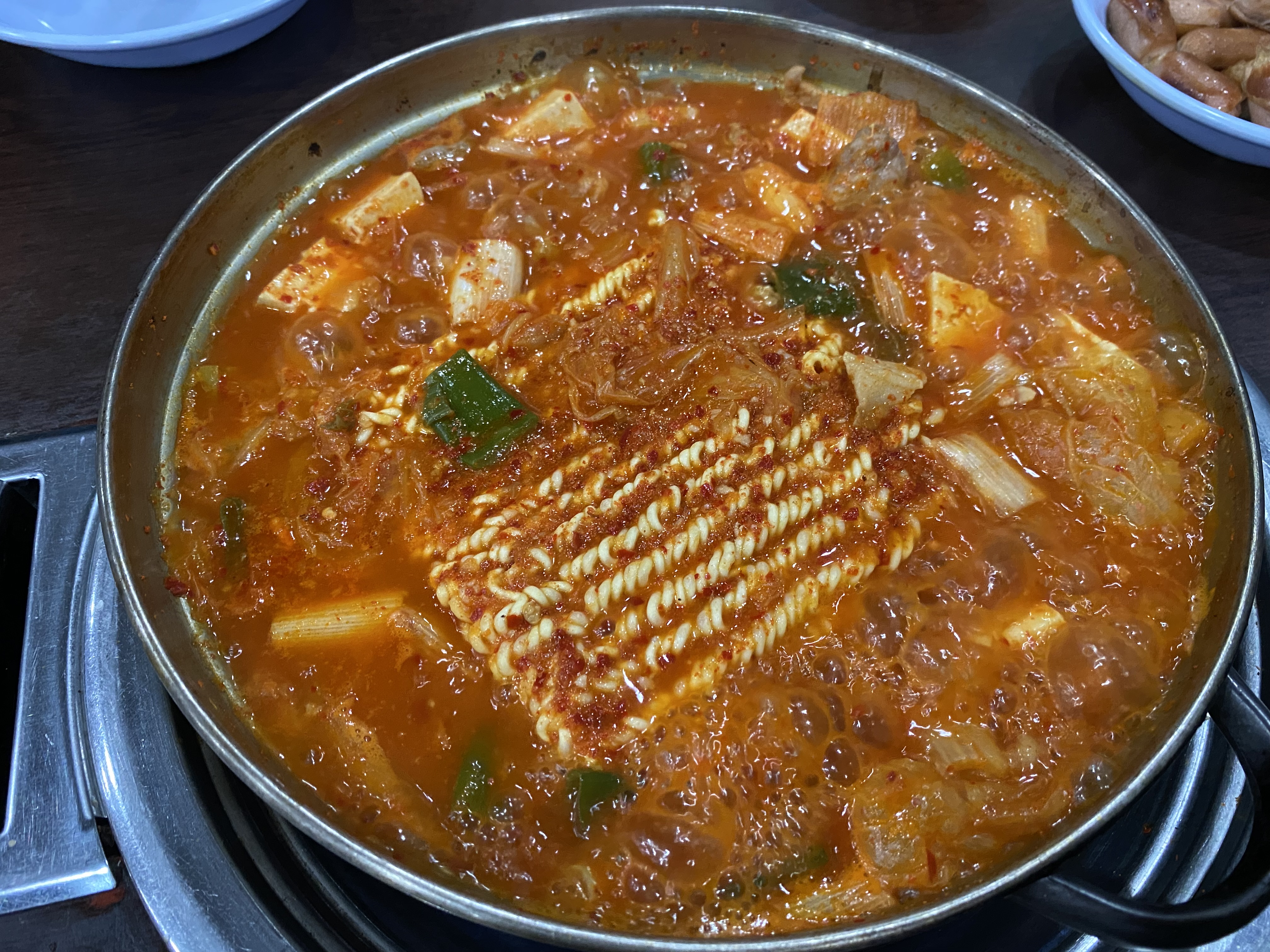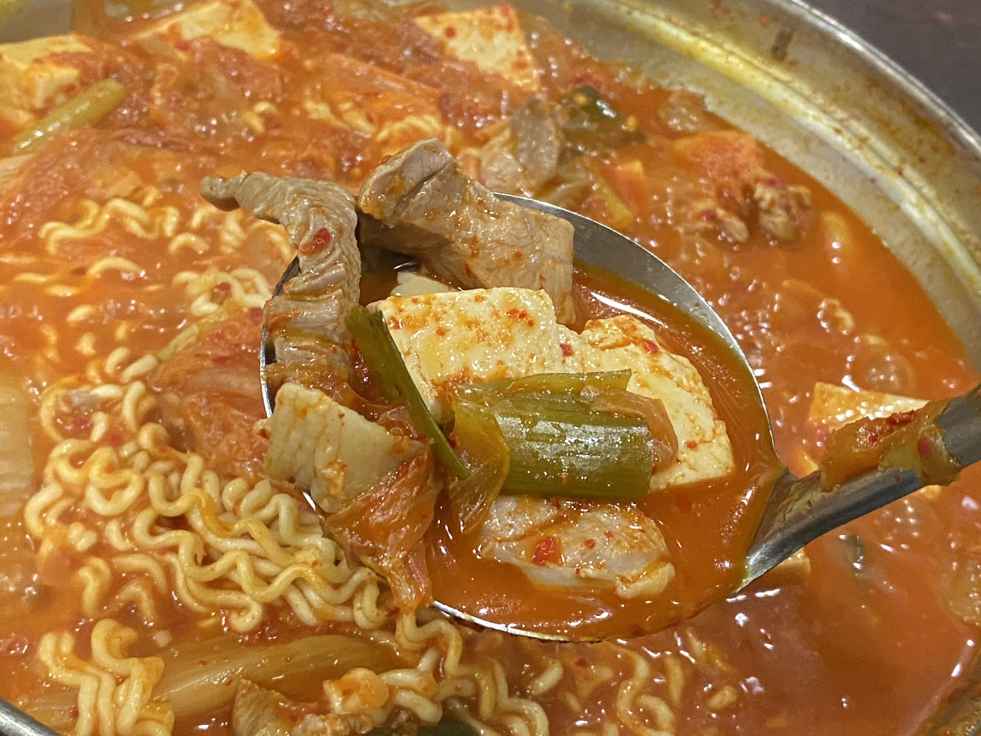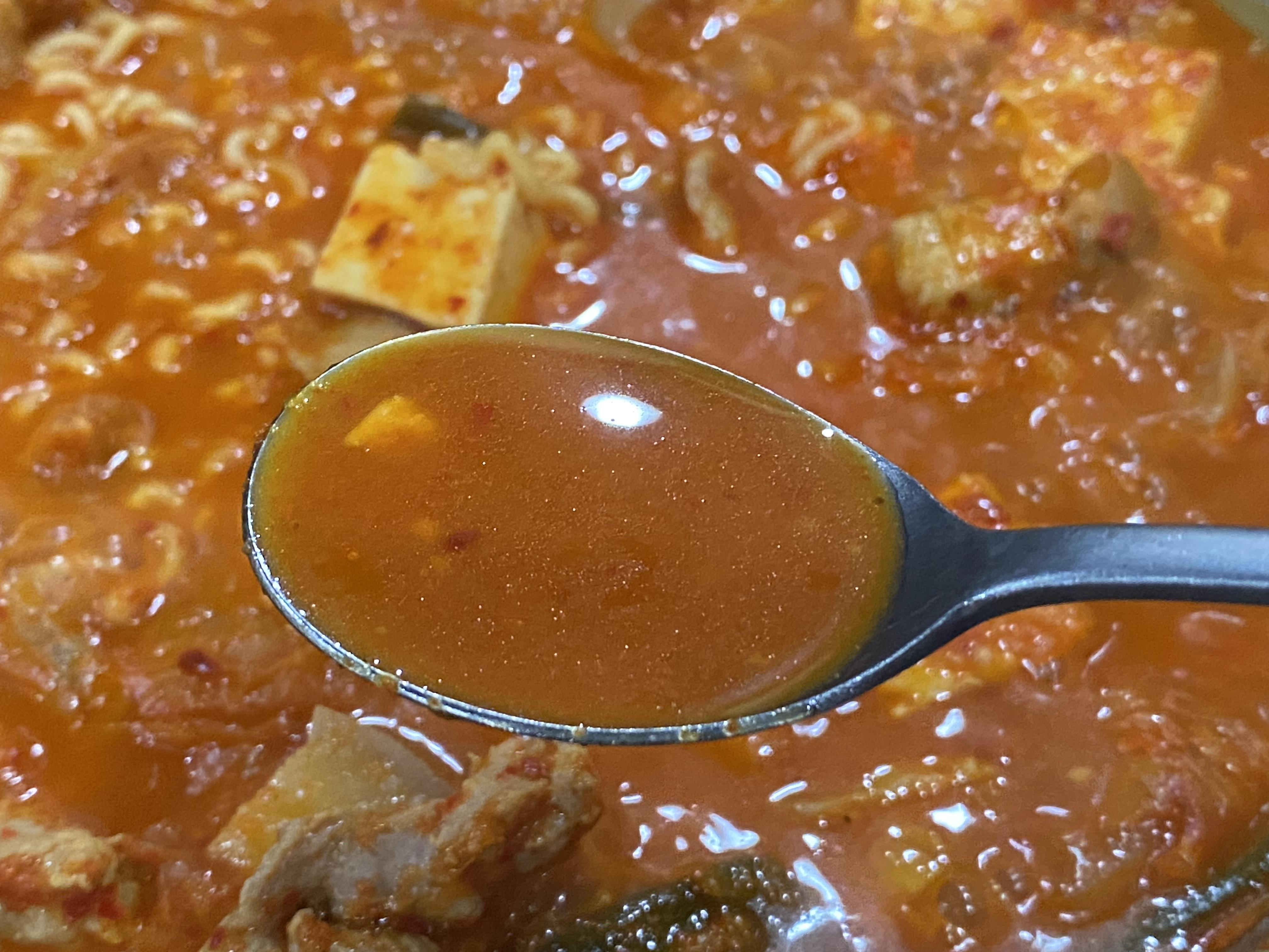 하나 추가한 라면사리가 적당히 다 익어가는 것 같았다. 그리고 덜 익었다고 하더라도 이때 한번 먹어야 그 다음 한 젓가락이 퍼지지 않고 먹을 수 있겠다. 꼬들한 면이 처음엔 좀 거부감이 들 수 있는데 뭔가 이상하게 매력 있다. 꼬들면이라는 표현도 누가 처음 말한 건지 갑자기 대단하게 느껴진다. 기본적으로 아까부터 강한 불로 끓였기 때문에 면발 안에도 간이 배어있겠다. 여기에 사장님이 라면수프를 넣으셨는지 안 넣으셨는지는 모르겠지만 기본적으로 면만 먹더라도 간이 딱 알맞게 맛있었다. 이게 정말 익숙한데 맛있는 그런 맛이다. 비주얼은 그냥 집에서 먹는 정감 가는 비주얼인데 맛 역시도 그렇다. 다만 수고스러움이 안 들어가는데, 이 가격이면 합리적으로 맛있게 즐길 수 있는 맛이랄까.