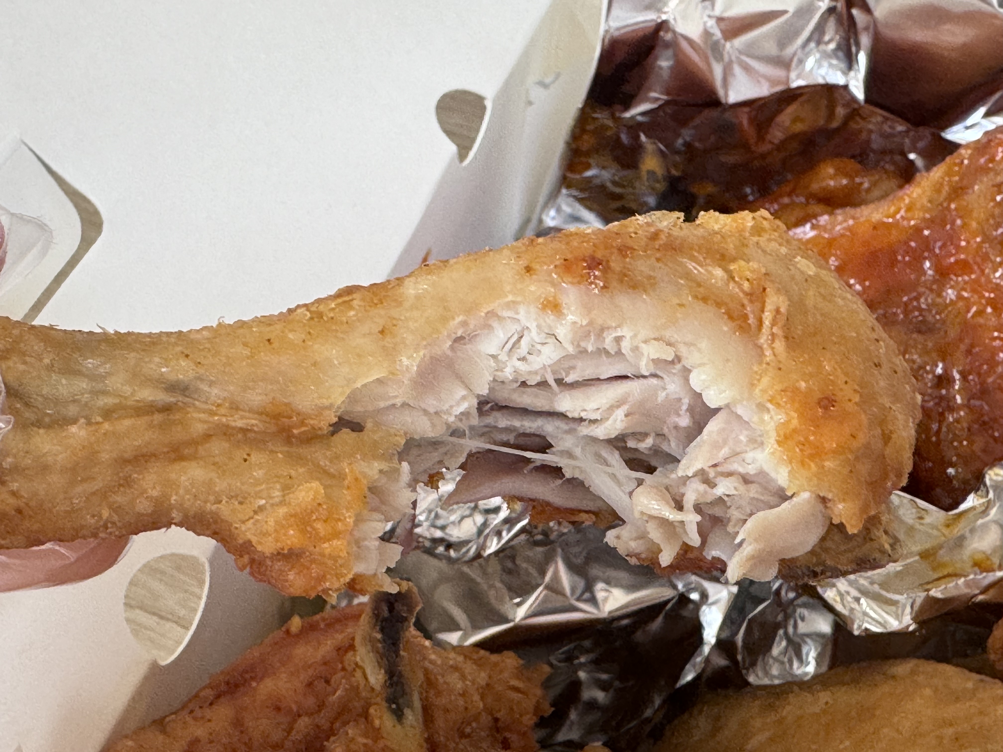 일단 튀김 옷이 얇다는 것이 제일 장점이 되겠다. 그렇다 보니 겉이 굉장히 바삭하다. 그런데 속살은 염지가 잘 되어서 짭조름하고 가슴살이 이렇게 촉촉하게 유지되어 있다. 사실 근데 프랜차이즈의 경우 지점 차이가 꽤 크다. 같은 곳에서 치킨을 시키더라도 누가 튀겨줬느냐에 따라 맛이 달라지니까. 근데 내 친구들의 경우 매니저로 오랜 기간 일을 하기도 했고, 아마 친구에게 튀겨 주는 것이니 더 신경 쓰기도 했을 것이다. 그래서 다른 곳들과 비교하여 더 맛있게 느끼긴 했을 텐데, 이날은 그때와 비교해서 살짝 아쉬웠다. 물론 매장에서 바로 먹은 것이 아니라 집에 가져와서 먹었다는 차이가 있긴 한데, 여전히 맛있었지만 그때와 비교하면 살짝 아쉽더라. 물론 충분히 맛있긴 했지만 그 부드러움이 살짝 줄어든 느낌이랄까. 퍽퍽까지는 아닌데 양념치킨 소스가 필요하긴 하더라. 뭐 근데 후라이드에도 양념치킨소스 찍어서 소금까지 곁들여 먹는 것을 좋아하긴 한다.