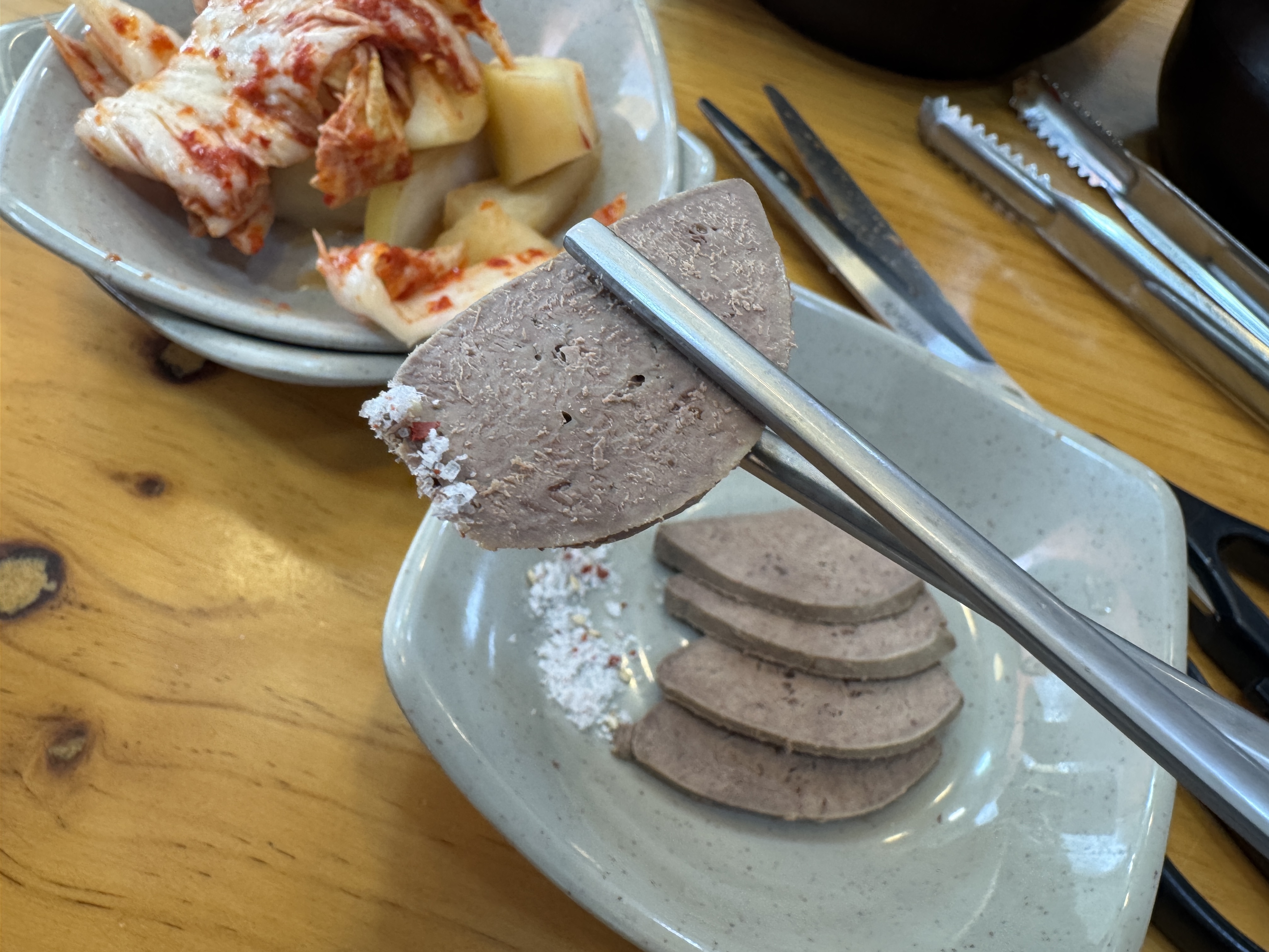 그리고 이렇게 간이 나오는 곳은 또 처음이었던 것 같다. 사실 수육이나 순대모둠처럼 기타 메뉴가 있기 때문에 이렇게 식전에 가볍게 요기하는 느낌으로 뭔가를 주는 곳이 많이 없다. 근데 여긴 매번 갈 때마다 저렇게 간과 소금을 주신다. 그래서 따로 먹기에도 좋고 맛 자체가 담백해서 순대국 먹기 전에 입맛을 해칠 일도 없고 좋겠다. 그리고 저 간을 나중에 순대국에 넣어서 먹으면 나름 포만감도 올라가고 뜨겁게 먹어서 맛도 있고 여러모로 활용하기에도 좋다고 생각한다. 그래서 여기서 한번 먹고 나면 조금 든든한 느낌이 드는 것 같다. 물론 순대국 자체가 완뚝을 하면 어딜 가든 든든하긴 한데 그래도 여긴 기본적으로 다른 곳들과 비교해 양이 넉넉한 느낌이랄까.