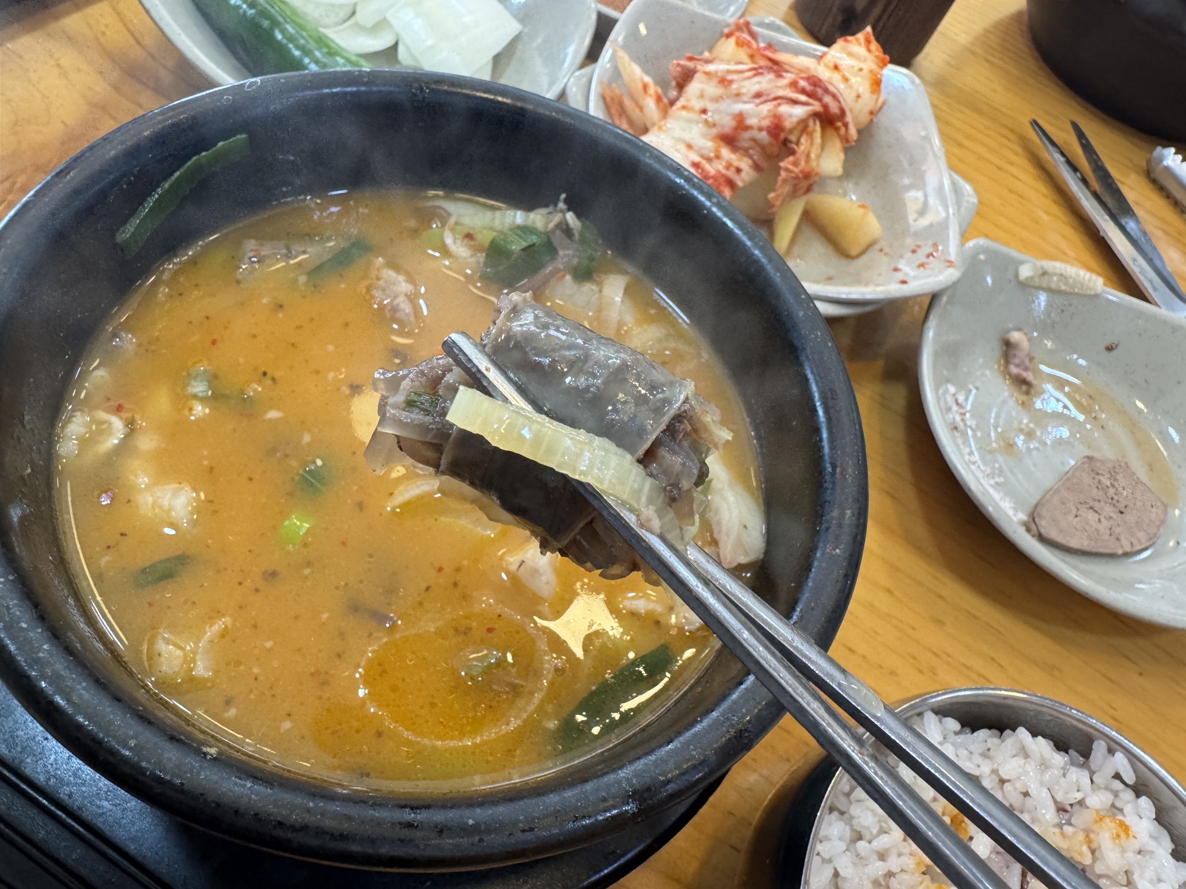 근데 여기 순대국은 확실히 기존에 먹어왔던 곳들과 다르게 특별하다. 아마 이런 육수는 여기서 처음 먹어보는 것 같다. 그게 뭐냐면 약간 한약재가 들어간 것 같은 육수 베이스다. 그러니까 사골이나 곰탕처럼 진하거나 깊고 맑은 국물은 알겠는데, 한약 냄새가 나는 육수는 여기가 처음이었다. 매장 내부에 들어오자마자 그런 냄새가 퍼지는데 처음엔 이거 호불호 있겠다 싶었다. 몸에 좋은 것은 알지만 맛도 중요하니까. 근데 실제로 먹을 때는 그 한약 베이스가 크게 느껴지지 않았다. 물론 내가 양념장을 따로 넣어서 그런 것일 수도 있겠지만, 벌써 여기를 다섯 번 넘게 방문하고 있는데 여태까지 그런 적은 없었다. 그래서 아마 여기 찾아오시는 연령대가 조금 있는 편인데 이런 포인트에서 매력을 느껴서 계속해서 오시는 것 아닐까 싶다.