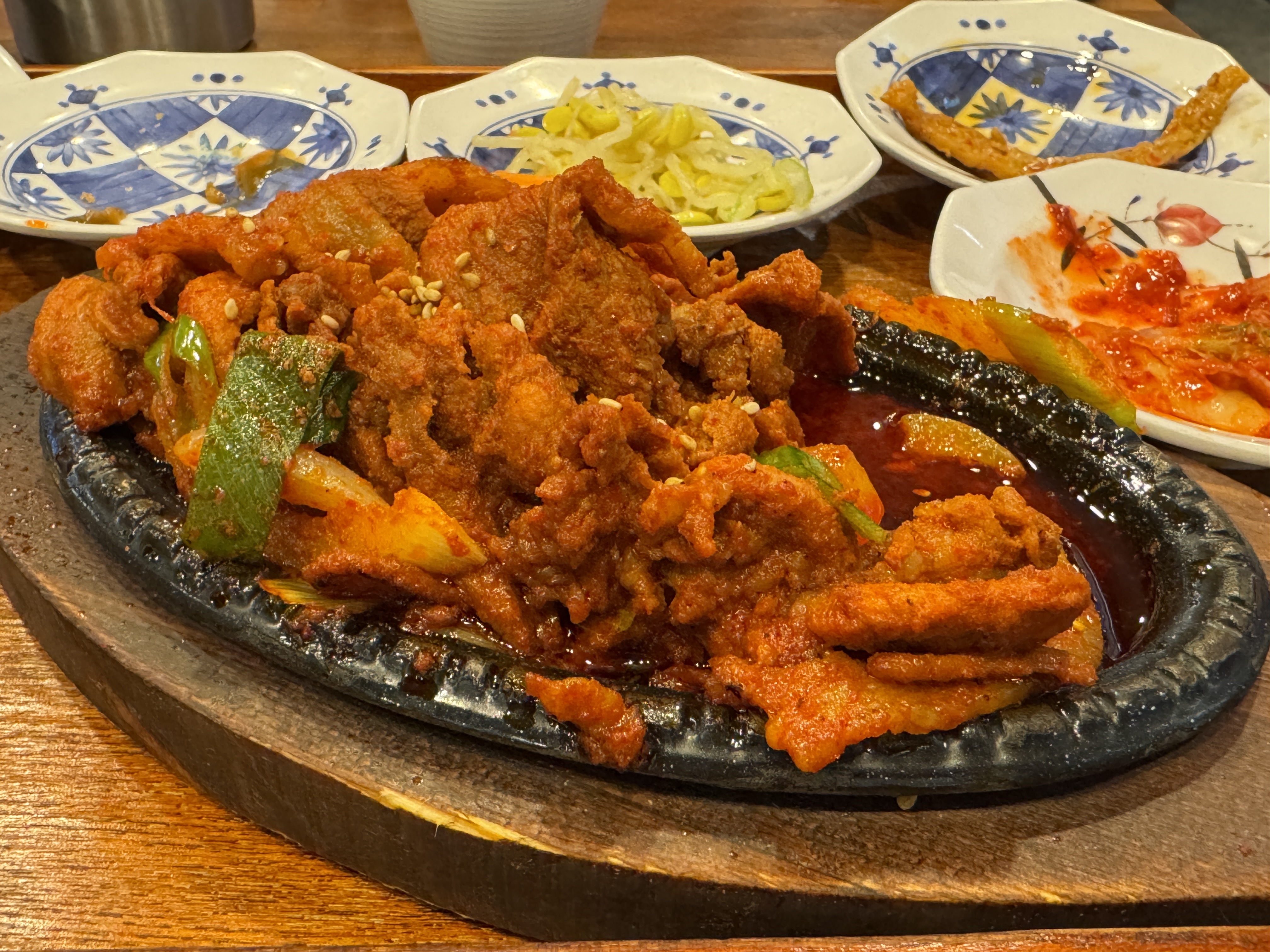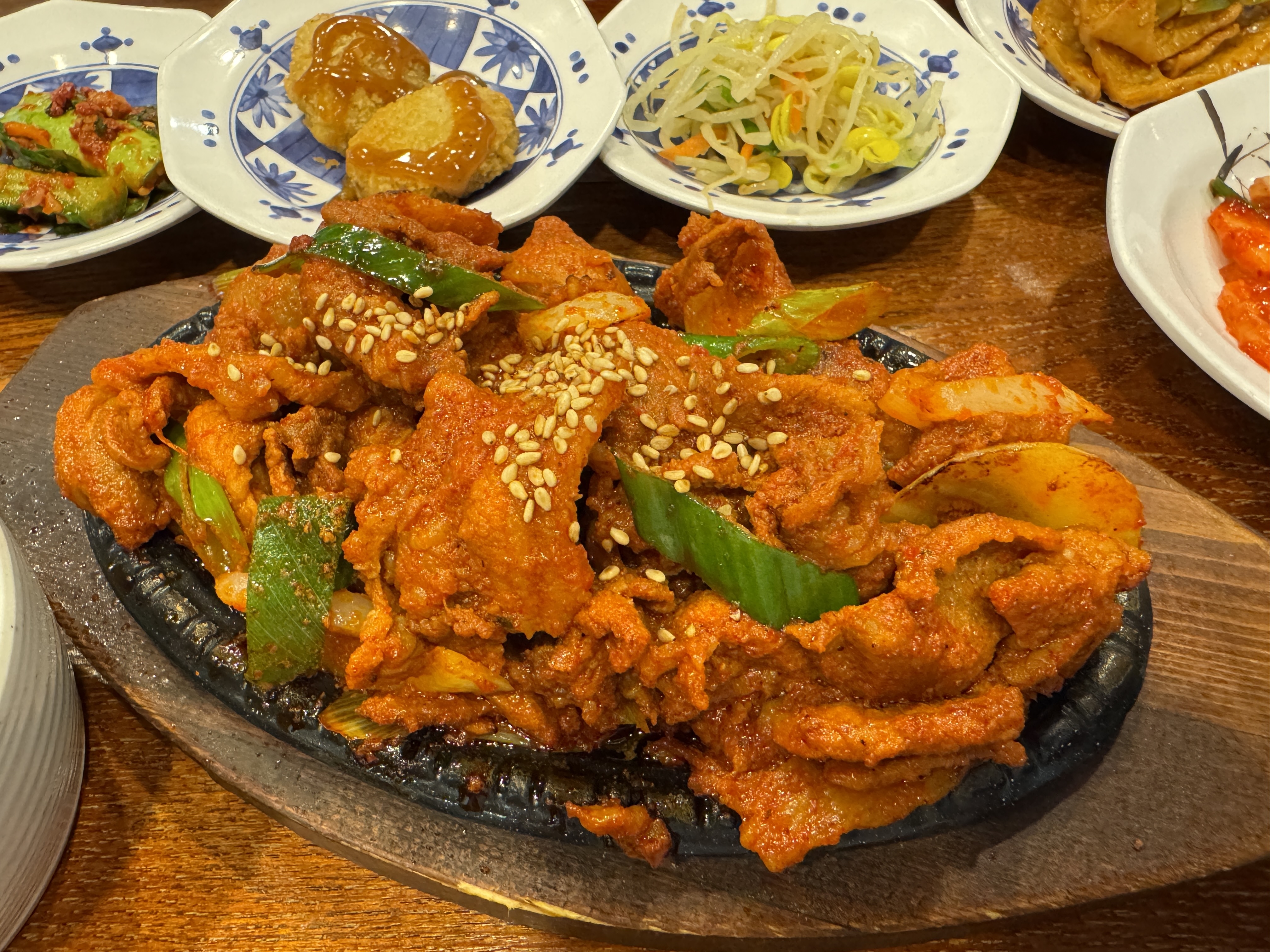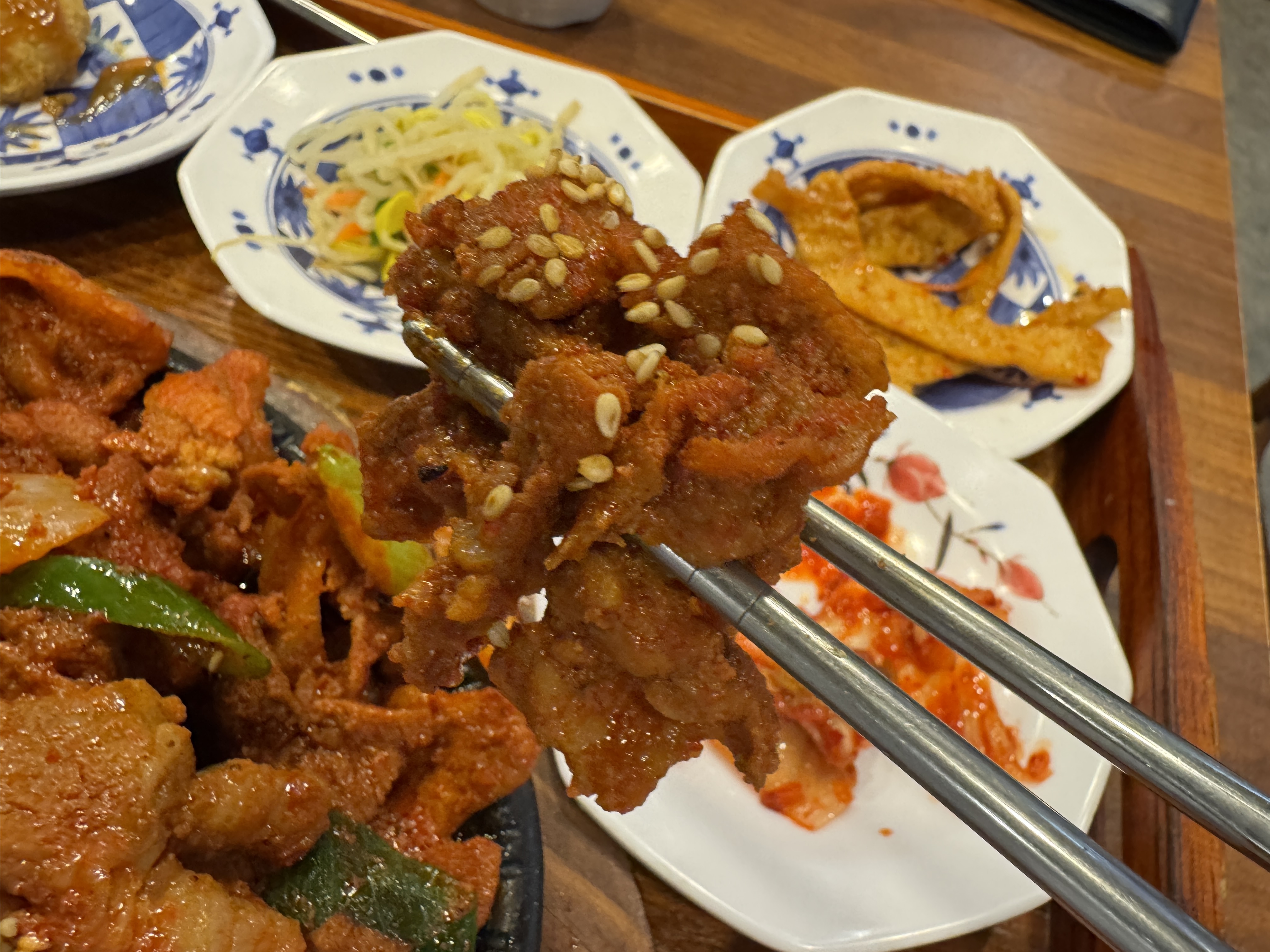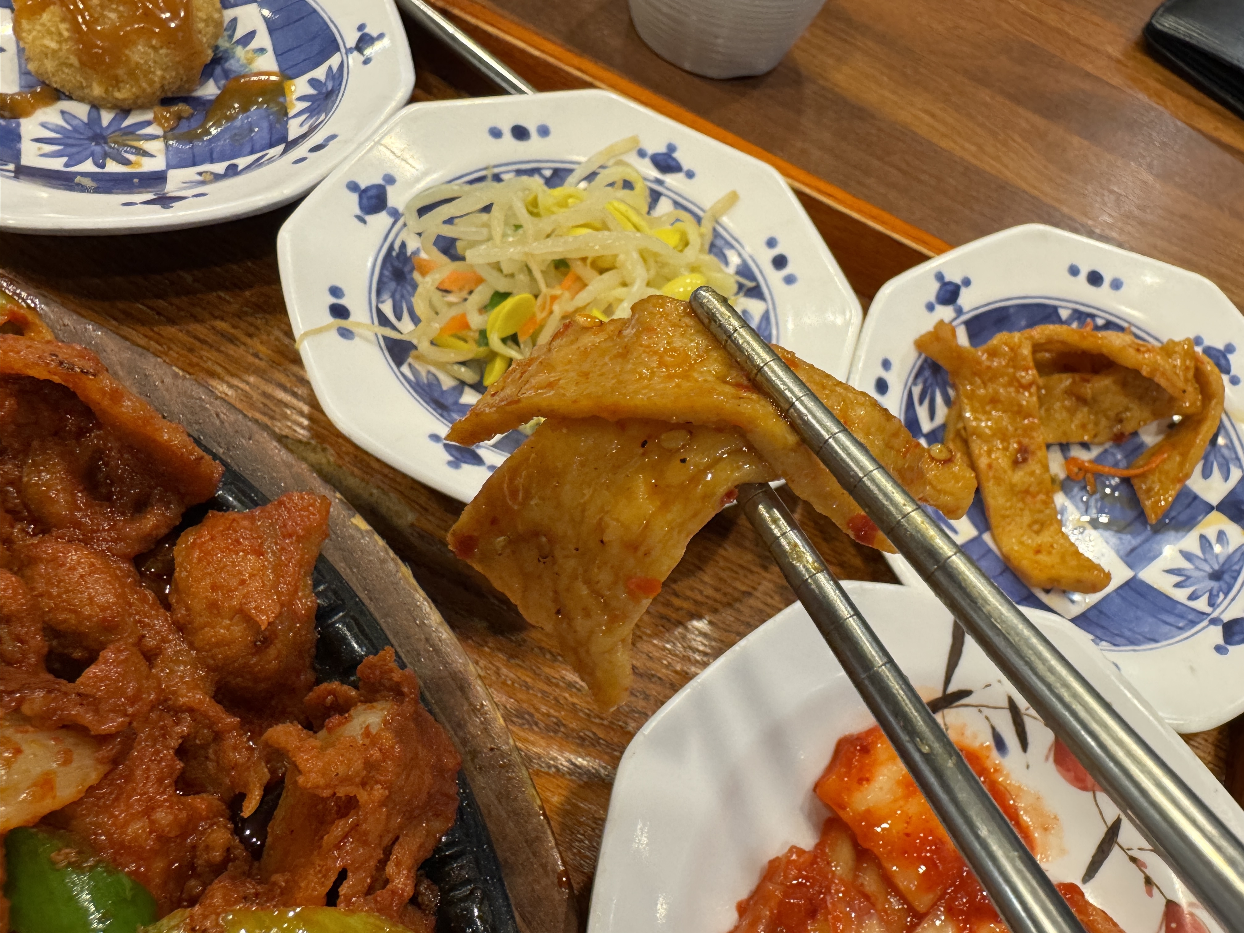 그렇게 뭘 먹을까 하다가 제육볶음을 주문했따. 사실 찌개류에서 고민을 했었는데 이날 낮에 찌개를 먹었던 것으로 기억해서 고기를 택하지 않았을까 싶다. 가격은 12,000원으로 솔직히 저렴한 편은 아니다. 원래 이런 백반 스타일의 가게들은 만원이 넘으면 안 되는데 여긴 위치가 위치인지라 넘더라. 그렇게 주문을 하고 좀 기다리니 메뉴가 나왔다. 점심시간이 아니라 그런지 미리 만들어두기보단 주문 후 바로 조리가 되는 느낌이었다. 그렇게 한상차림이 나왔고 바로 먹기 시작했다. 역시 맛있더라. 어떻게 보면 간이 센 편을 좋아하는데 여기 딱 심심하지 않게 맛이 괜찮았다. 감칠맛도 살아있고. 확실히 뭔가 딱 요리 내공이 있으시구나 싶었다. 그렇게 먹다가 갑자기 이 돼지고기가 국산인지 아닌지 궁금해졌다.