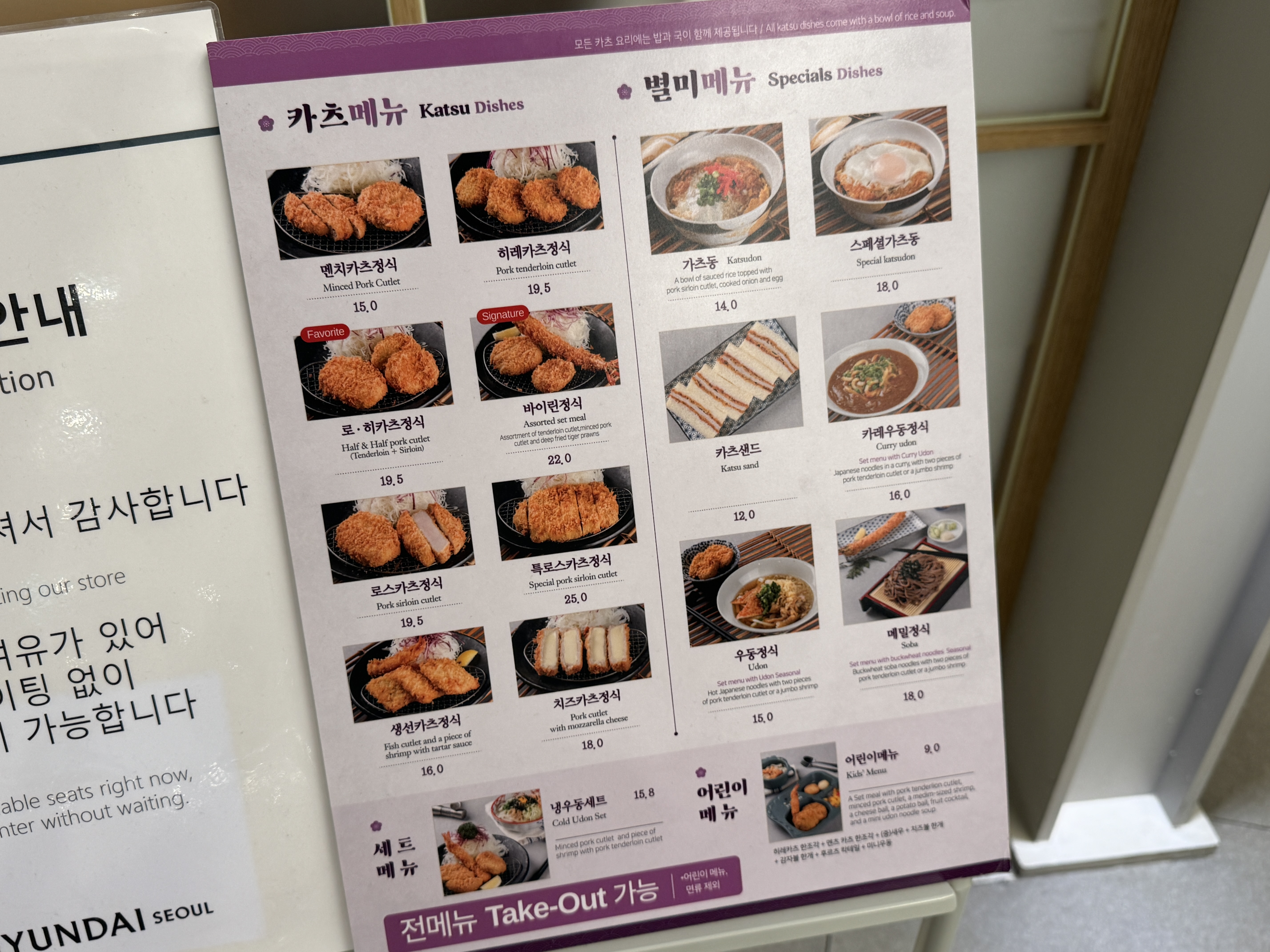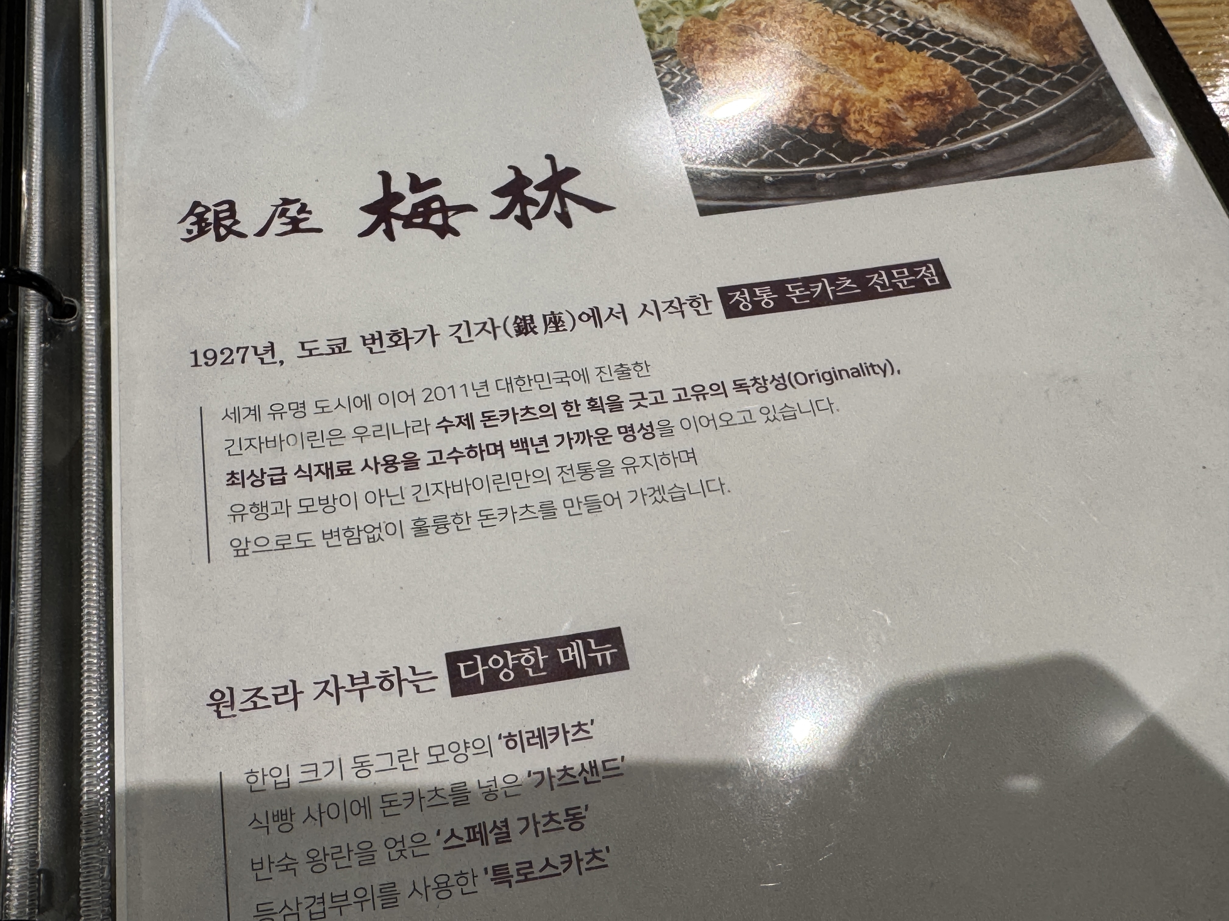 그렇다고 막 여유롭고 한적하다는 것은 아니고 어느정도 평온한 기분을 느끼며 식사를 할 수 있다는 말이 되겠다. 1927년 도쿄에서 시작해 한국에 상륙한 더현대 긴자 바이린 돈카츠라는 곳이다. 이날의 경우 혼밥을 했었고 원하는 좌석에 앉아 식사를 즐기 수 있었다. 처음부터 이 가게를 안 것은 아니고 뭘 먹을까 고민하다가 여길 찾게 되었다. 돈까스 자체는 좀 헤비한 느낌이 들어서 별로 안 먹고 싶었는데 또 일본 도쿄에서 운영하는 가게가 들어왔다고 해서 맛이 궁금했다. 또 긴자의 경우 내가 도쿄에 놀러 갈 때마다 묵는 지역인데 거기선 가본 적이 없지만 서울에서 먹어보는 것도 괜찮겠다 싶었다. 분명히 식재료들의 차이로 맛이 다르긴 할 텐데 그래도 뭐 경험해 보기엔 괜찮겠다 싶었다. 그렇게 안으로 들어와 자리를 잡았다.